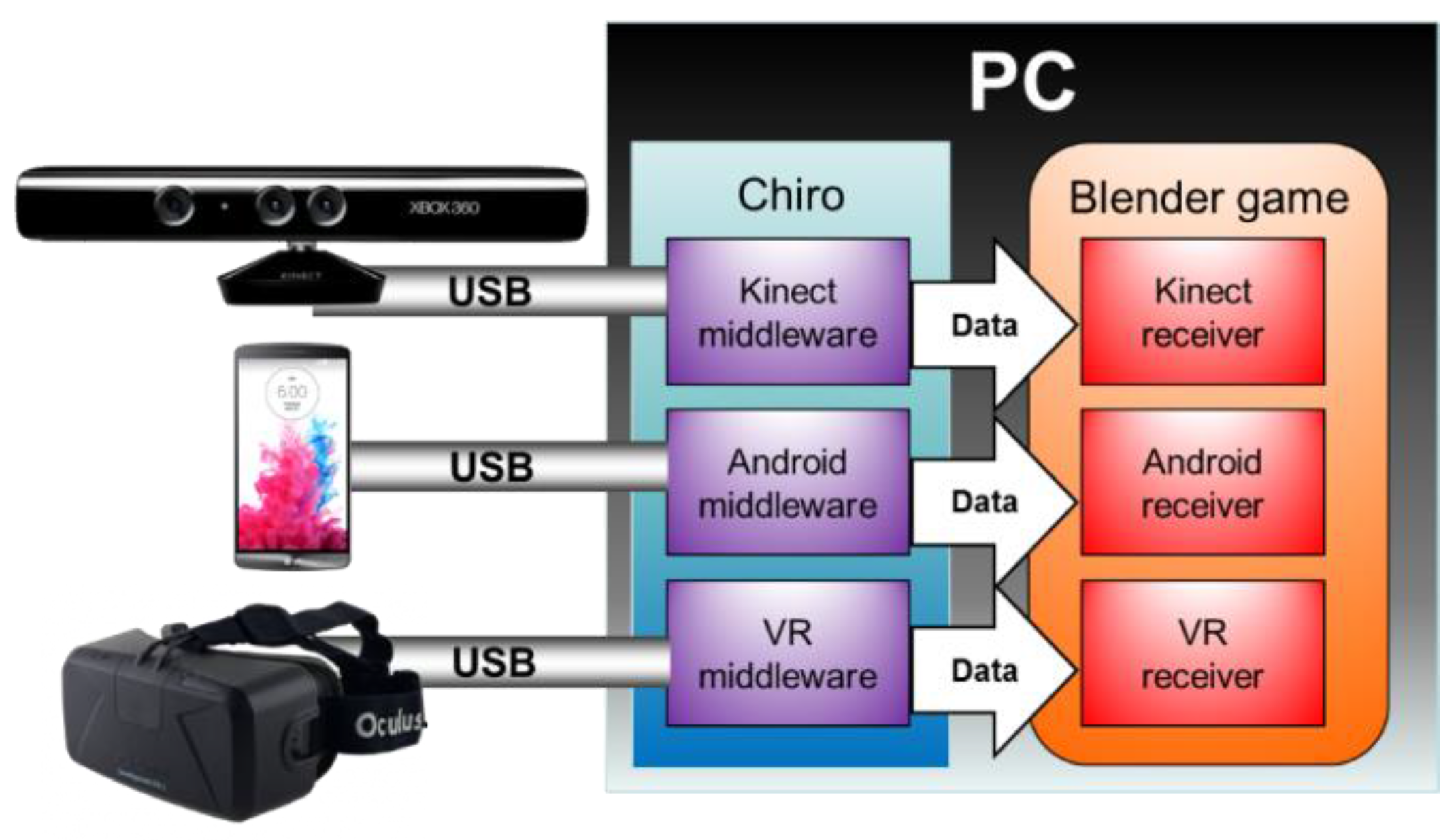 The middleware for all devices are stand-alone programs, each implemented in the language needed for the device, and merged in a software container called “Chiro” as shown in Figure 1. Each middleware individually handles its communication with Blender via USB and a corresponding add-on.
