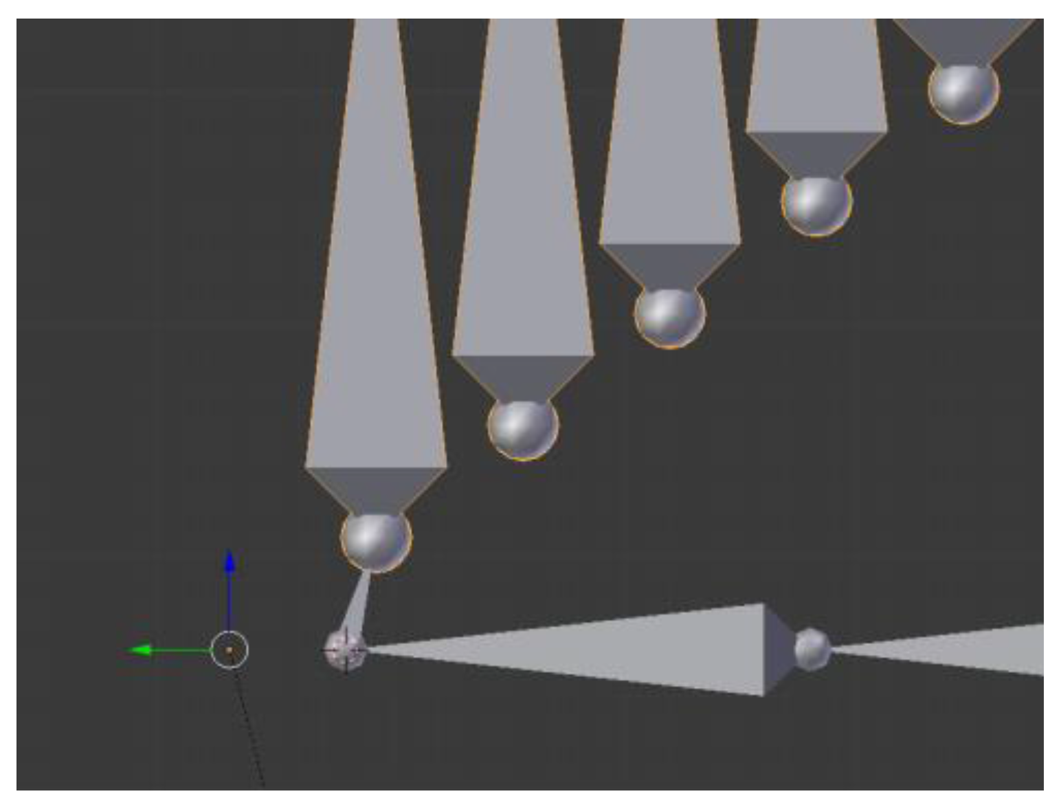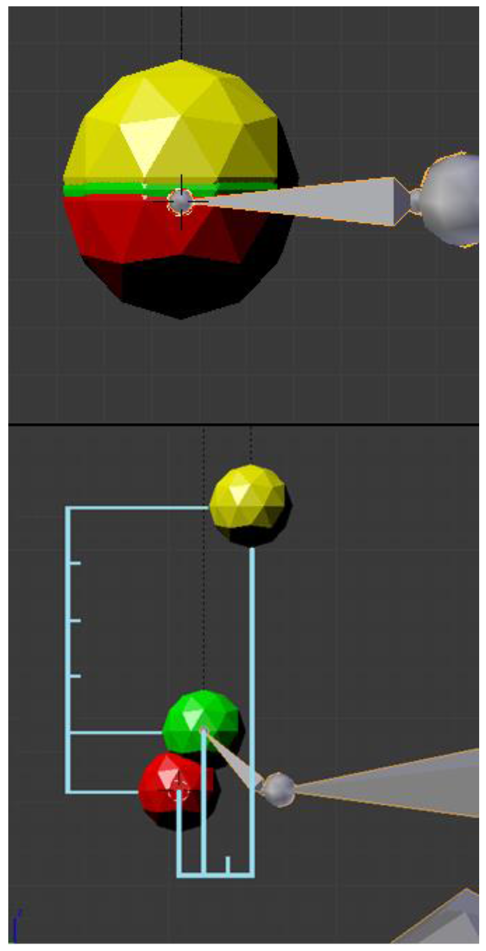 Figure 3 illustrates how this concept is handled in Blender for the hand as an example case. We added coloured spheres to mark the end of the hand’s bone: the red one represents the position of rest, which is recorded as the origin of every movement; the green one marks the real displacement;, and the yellow sphere is equal to the desired amplified displaced position.