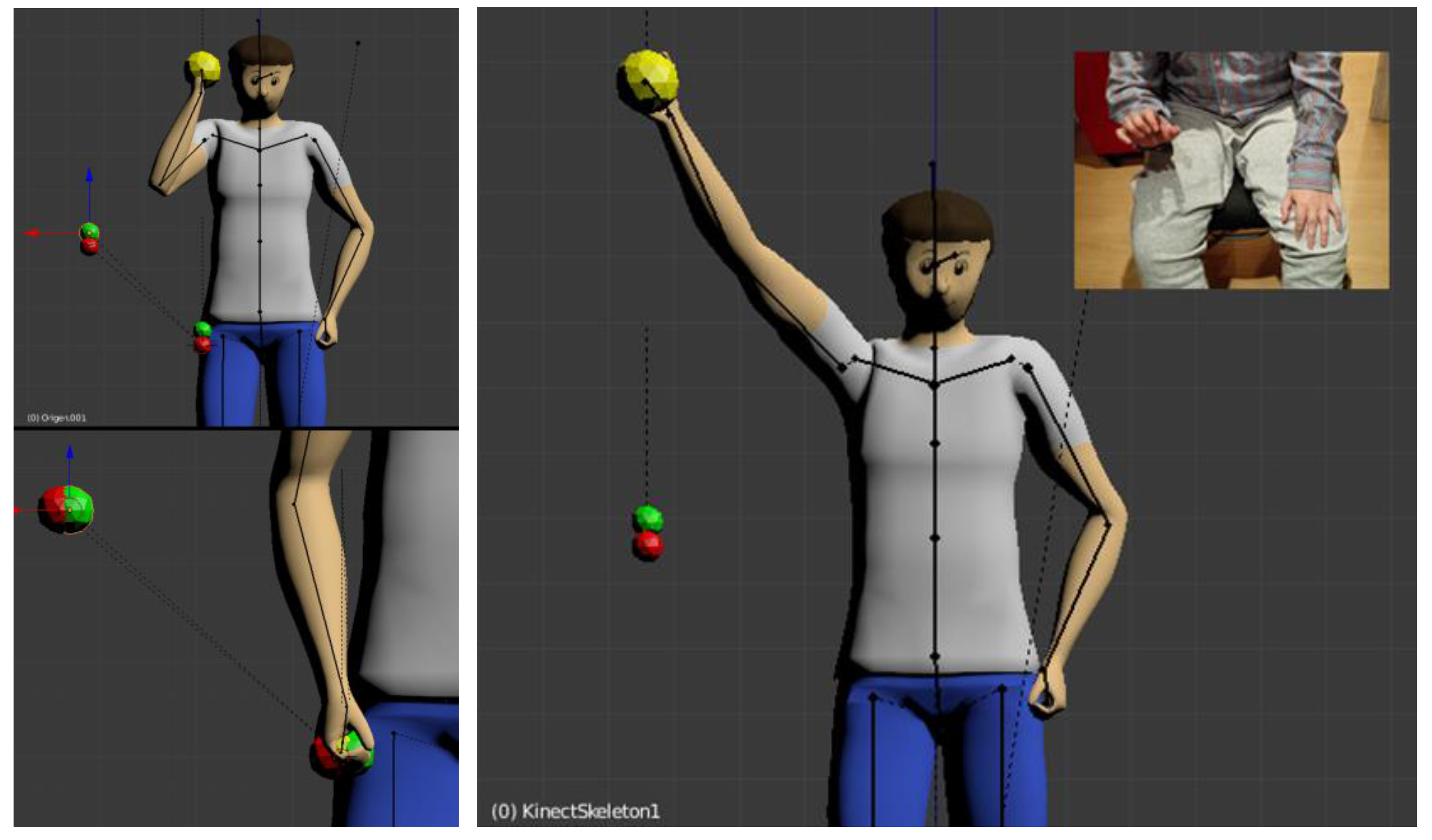 The process described up to this point is realized for every outer limb, which means hands and feet. The depending bones (arms and legs) are following through the concept of inverse kinematics. In this way, all bones and joints of the skeleton that are related to one “leading” joint, are following it in a natural manner. Figure 5 illustrates how the real and the amplified movements are interrelated. As before, the red sphere represents the resting position of the player’s hand (as the player here is seated in a wheelchair, it is placed at the height of the avatar’s hip); the green sphere represents the vertical displacement of the player’s hand; and finally, the yellow sphere represents the amplified point, where the avatar’s hand has to be. In the large image on the right, the user is doing his maximum possible movement (see the photo), which is translated to a complete outstretching of the avatar’s arm. On the upper left image, the movement is smaller, such that the hand reaches the shoulder.