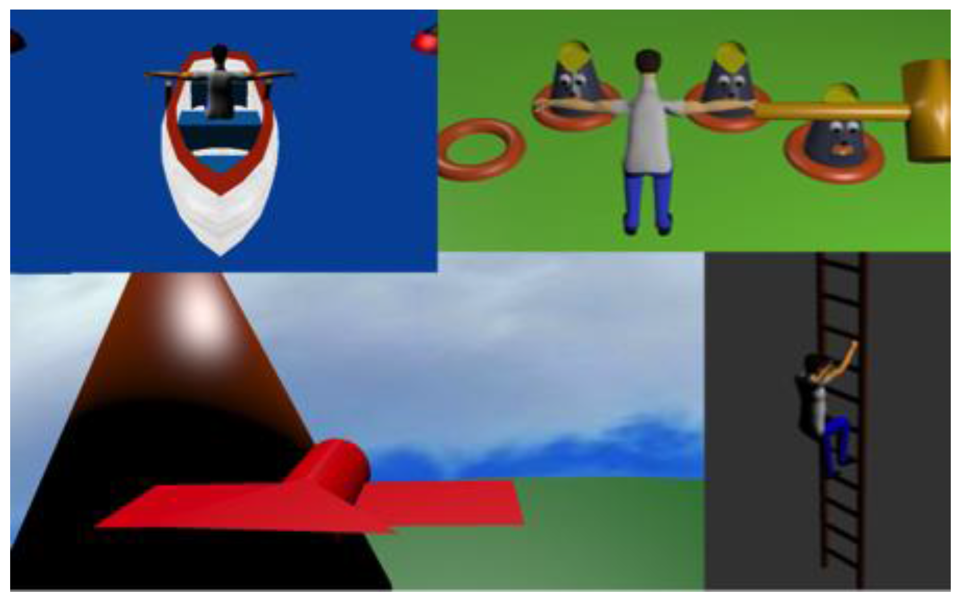 Visualization of the four mini-games (from left to right, top down): “The Boat”, “Whack-a-Mole”, “The Paper-Bird”, and “The Ladder”.