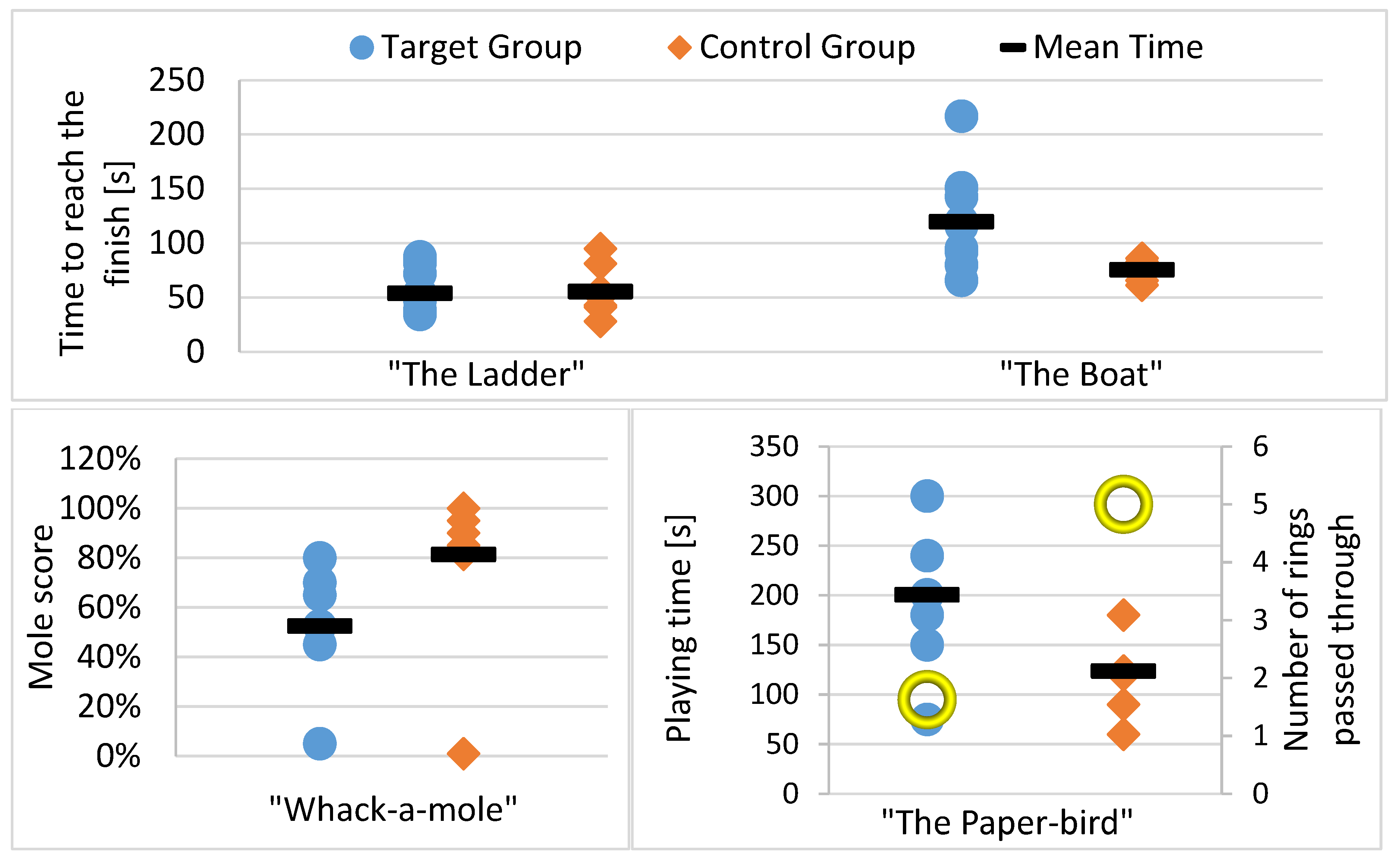The individual results obtained by each subject were visualized in the form of spread plots in Figure 7. Here, the target group (blue dots) and the control group (orange rhombs) can be compared. The average values from Table 2 were added as black bars. In addition, Figure 8 shows some scenes from the trials to illustrate the environment. In the following section, the results and observations from the tests are analyzed individually for each game.