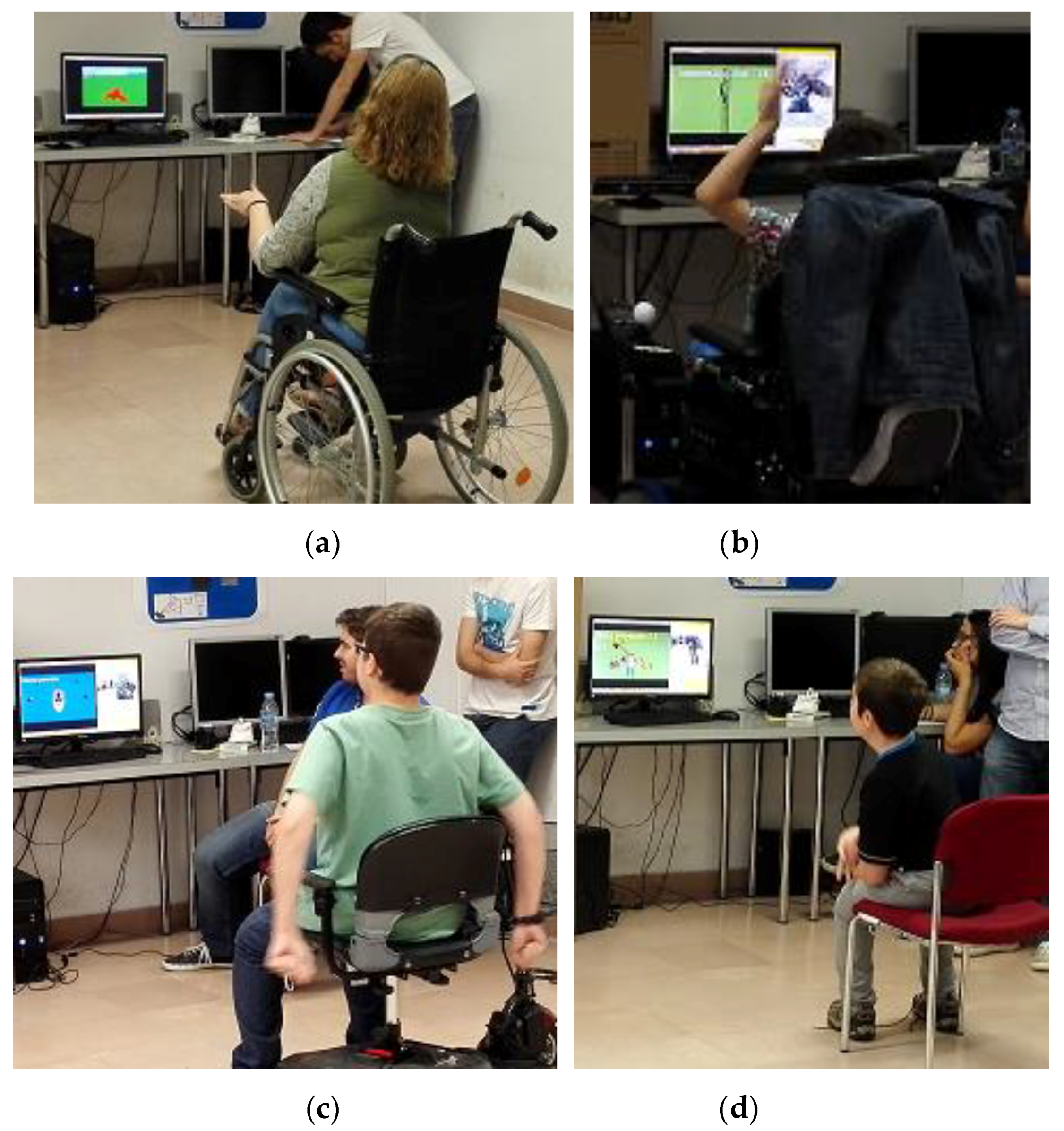 To test these functionalities, the four mini-games were given to two groups of potential users for six days: one group consisted of eight children and three adult women affected by different disabilities as indicated in Table 1. Three of these children had to be excluded from the evaluation, as there were detection issues with their wheelchairs. (Ideally these and future tests should be run on larger sample sizes.) The participants were recruited in Madrid, Spain, at the Neurological Muscular Diseases Association (ASEM) [47] and the Sports Integration Foundation (Fundación TAMBIEN) [48]. The comparative group was formed out of eight children (ages 7–13 years), without any known physical dysfunction.