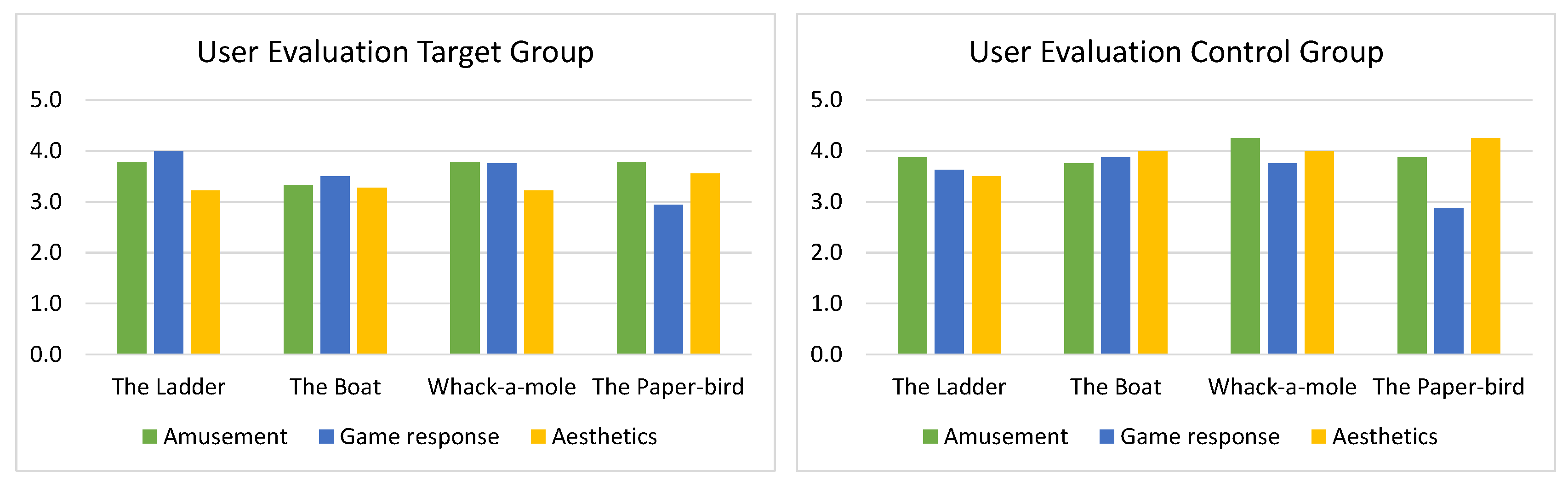 In the game evaluation part, the users were asked to evaluate the fun-factor, the game response, and the aesthetics of the four mini-games. Figure 9 shows the average points scored on a 5-point Likert scale of those aspects for each game and separated for the target and the control group. The evaluations concur with the observations made during the trials: “The Boat” was the least funny one; “The Ladder” had the best response for the target group, while “The Paper-Bird” had the worst for all. In aesthetical aspects, “The Paper-Bird” wins. For the target group, it is not easy to conclude, which game is considered the funniest, but the control group mostly liked “Whack-a-Mole”, probably due to the action. However, no category was evaluated as either excellent or poor.