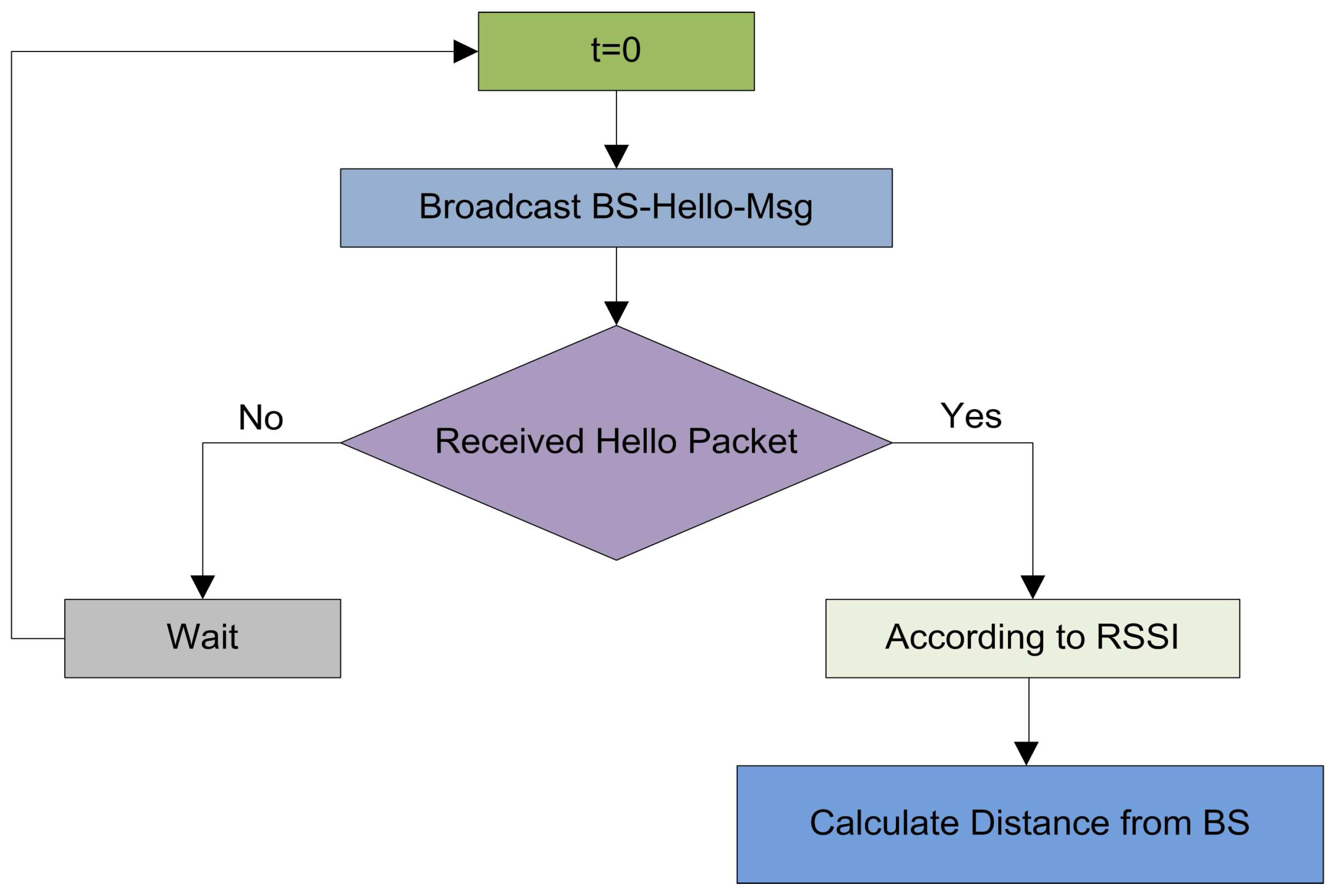 In the initialization phase, the BS broadcast a -- at a certain power level. This message contains the coordinates of the BS. When this message is received by the sensor nodes, the nodes can estimate the distance of the BS according to the received signal strength indication. The illustration of the network initialization is given in Figure 1.