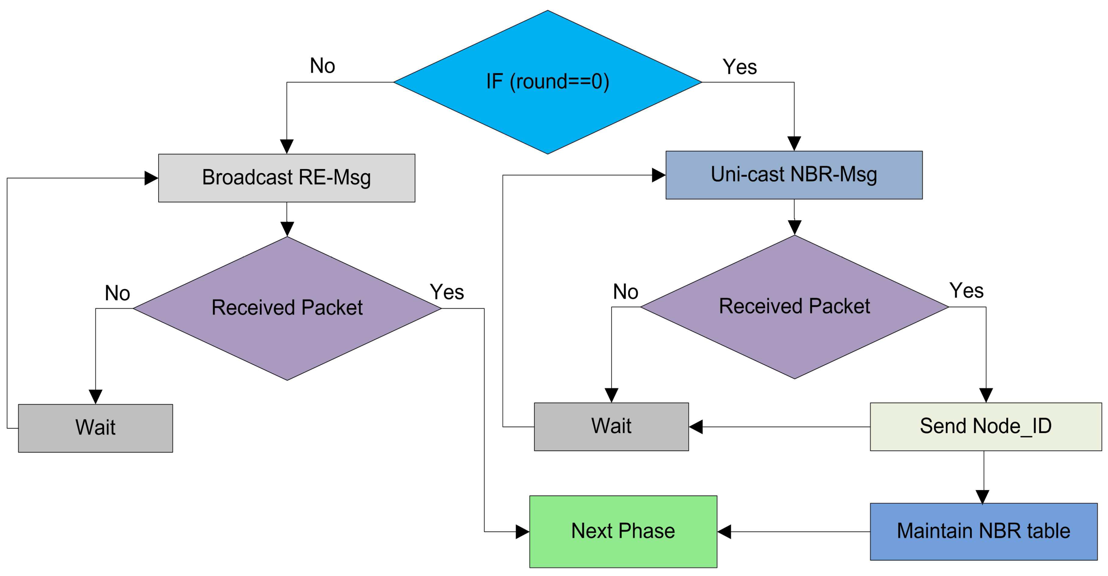 The main purpose of neighbor discovery is that in the beginning no reliable infrastructure is found among the for communication, and data exchange becomes crucial for WSNs. The setup phase starts with every round with the aim to upgrade the system. When all the in a network become familiar about some coordinates related to them, like: received signal strengths, and the node IDs, the probability of successful communications between nodes increases. We use a NBR-Msg exchange method to inform neighbor nodes with the node IDs, the link status, and all other coordinates of the neighbor nodes in a network as depicted in Figure 3.