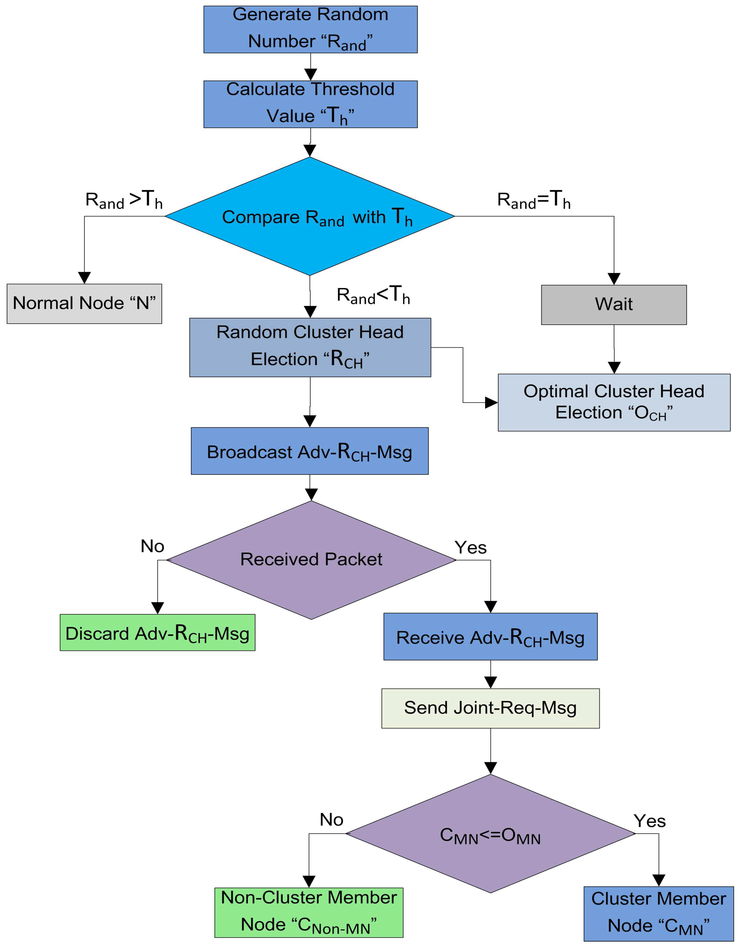 After the random CH selection process, the nodes which are selected as advertise their status message as -- on their intra-cluster communication range. The nodes which receive this advertisement message, send the -- to these . When the receives this joint request, it checks the number of . If the number of are less than the pre-defined number, then add this node as a for this round. The complete random CH selection and random cluster formation procedures are defined in Figure 5.