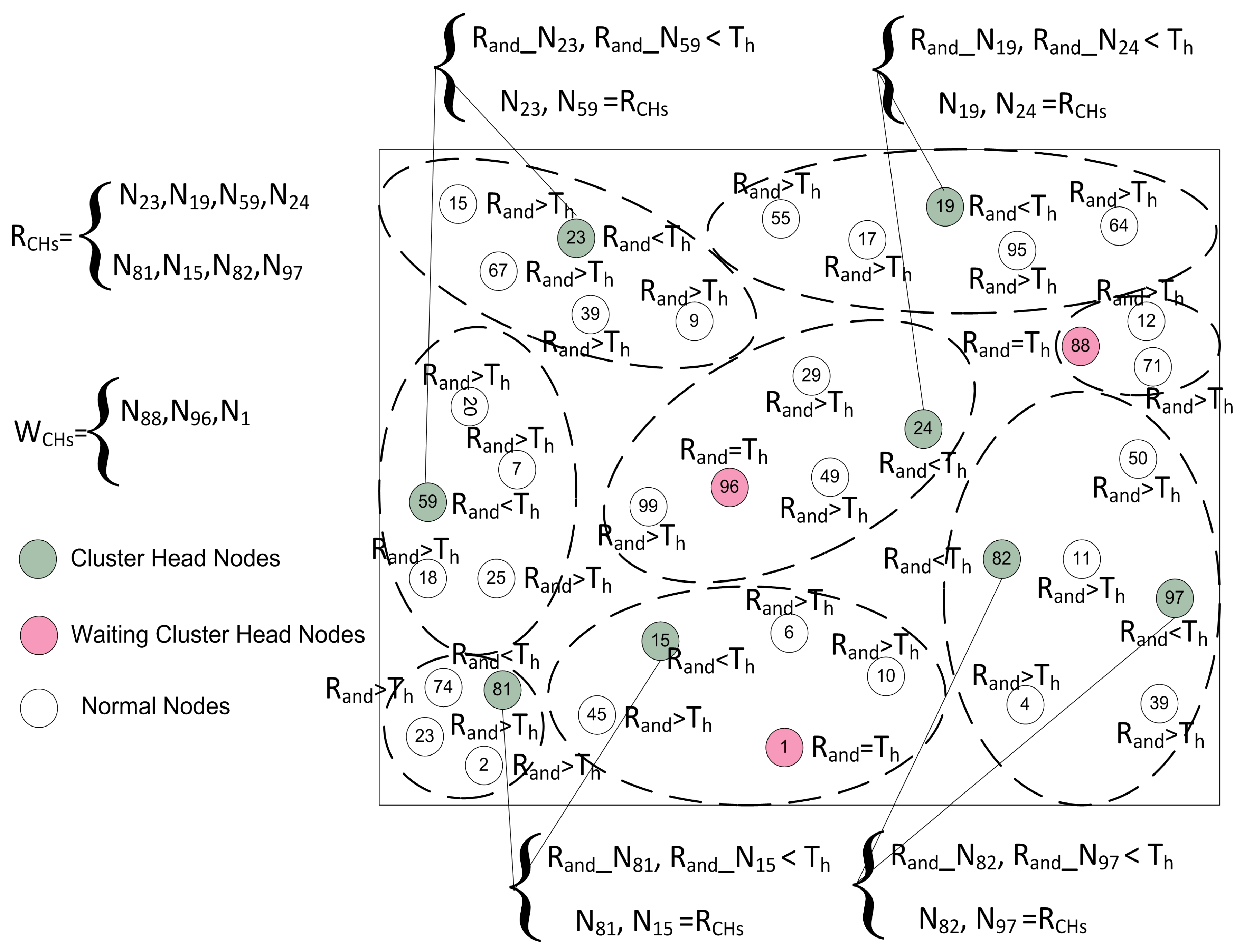 where, P is the desired percentage of CHs, r is the current round, is a node i, and G is the set of nodes that have not been CHs in the previous rounds. After calculating the threshold, each node in the network generates a random number and calculates its status for the current round on the basis of the generated number. The random selection of CHs is made by each node itself on the basis of following three cases:
