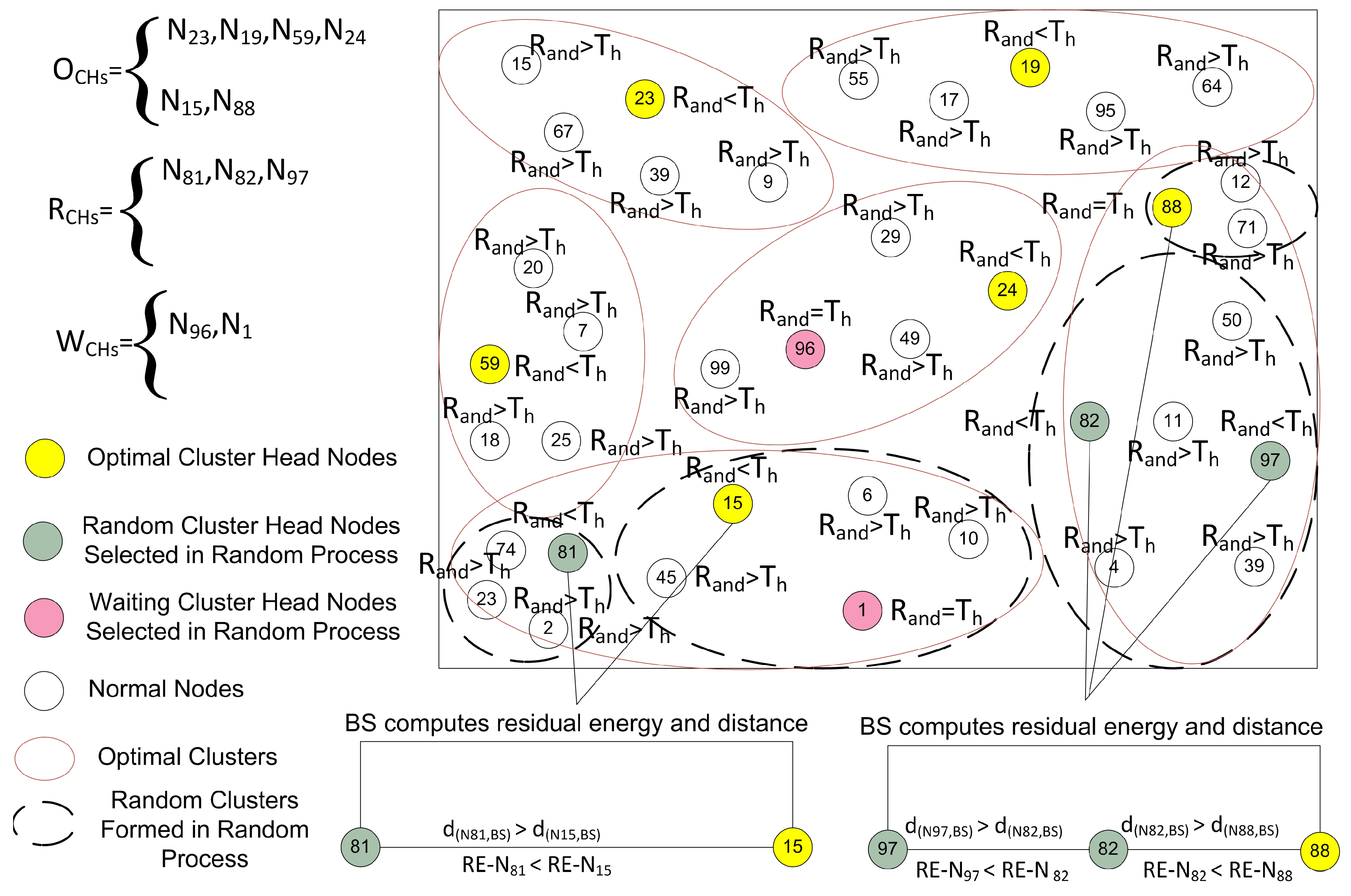 - : The BS selects some new from the waiting CHs equal to the optimal value. If the are not enough, then the BS can also select some new CHs equal to the optimal number from the root nodes.