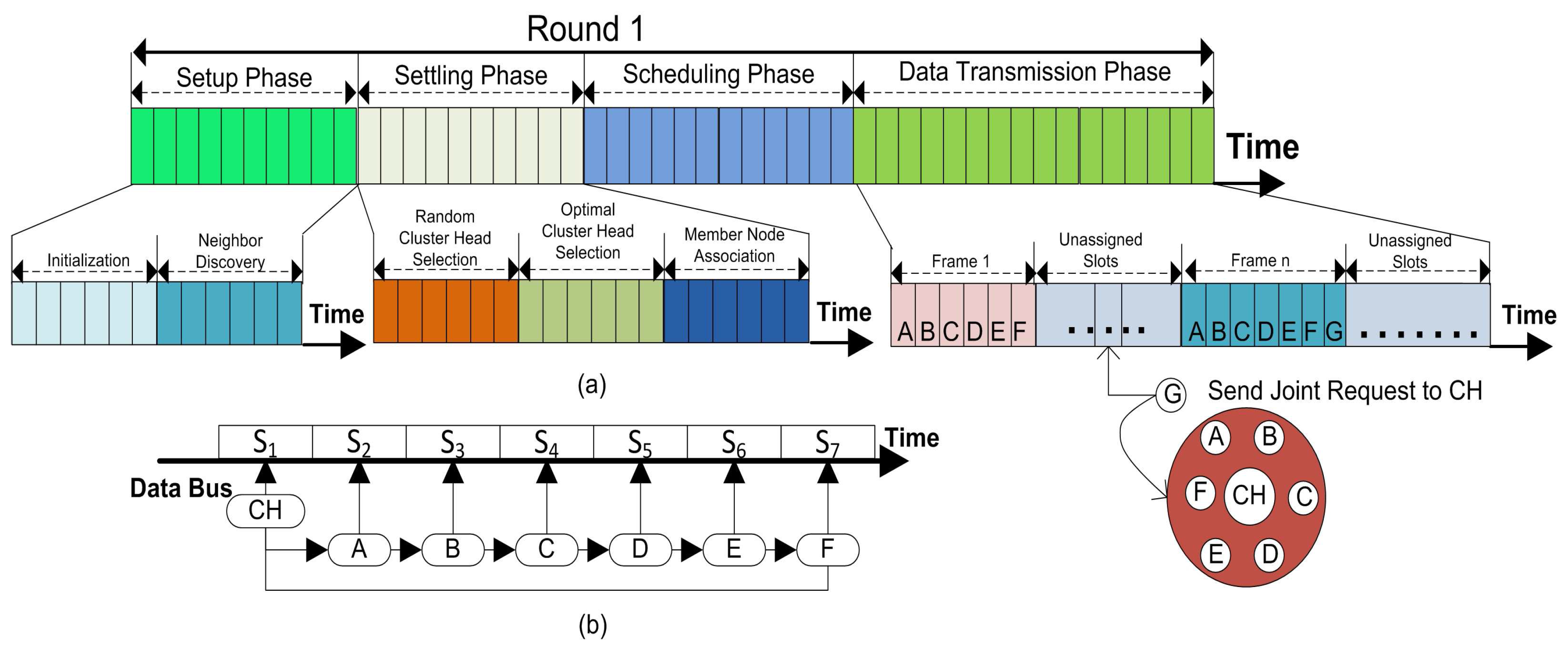 We partitioned the working of our proposed method function into rounds. Every round is then further separated into four phases such as; (1) setup phase; (2) settling phase; (3) scheduling phase and (4) data transmission phase. Whereas, the random and the optimal number of CHs selections provide a way for load balancing and the uneven energy distribution problem as well as help in keeping the stability of the network. For the third and fourth phases included in the overall energy consumption of the network, more details concerning each of the phase are explained in the next subsections.