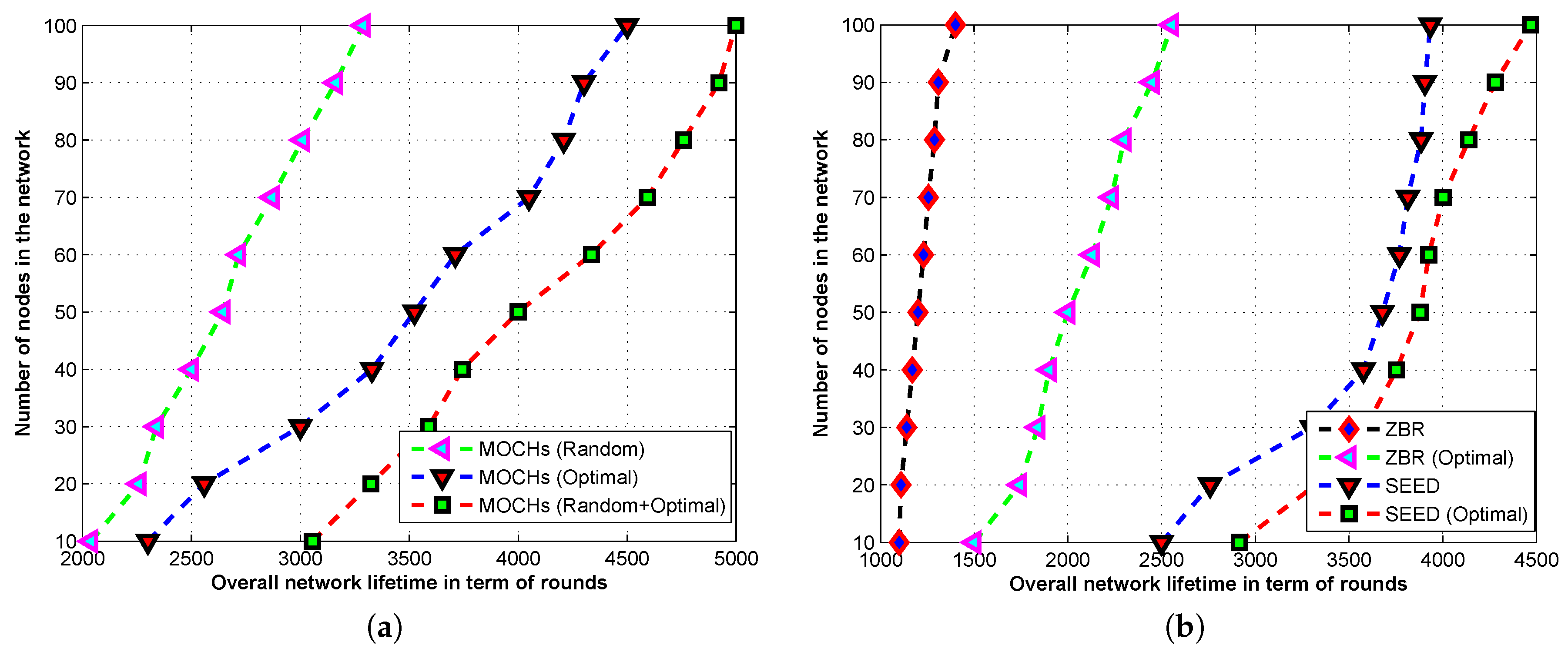 Analysis of random and optimal CHs selection on the lifetime of ZBR, SEED, and the proposed algorithm. (a) The effect of random and optimal CHs selection on the lifetime of MOCHs; (b) The effect of optimal CHs selection on the lifetime of ZBR, and SEED.