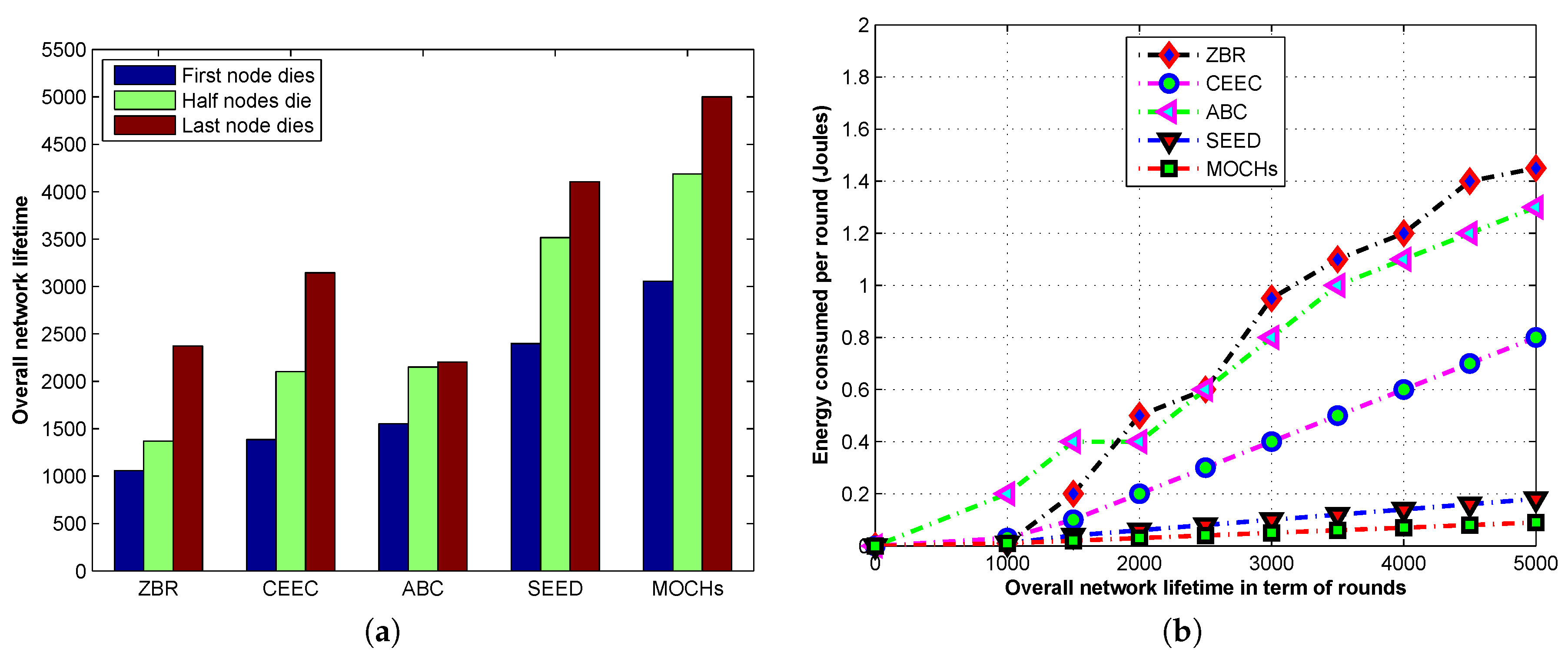 The stable and unstable regions comparison of MOCHs with SEED, CEEC, ABC, and ZBR in the lifetime of the network. (a) The network stability comparison; (b) The analysis of energy consumption per round.
