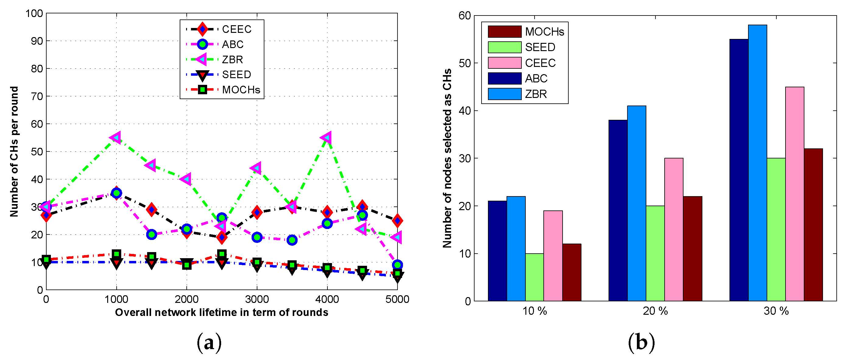 The comparison of total number of CHs selected per round in the lifetime of the network of MOCHs with different protocols. (a) The analysis of number of CHs per in the network; (b) The effect of different of number of CHs on the network.