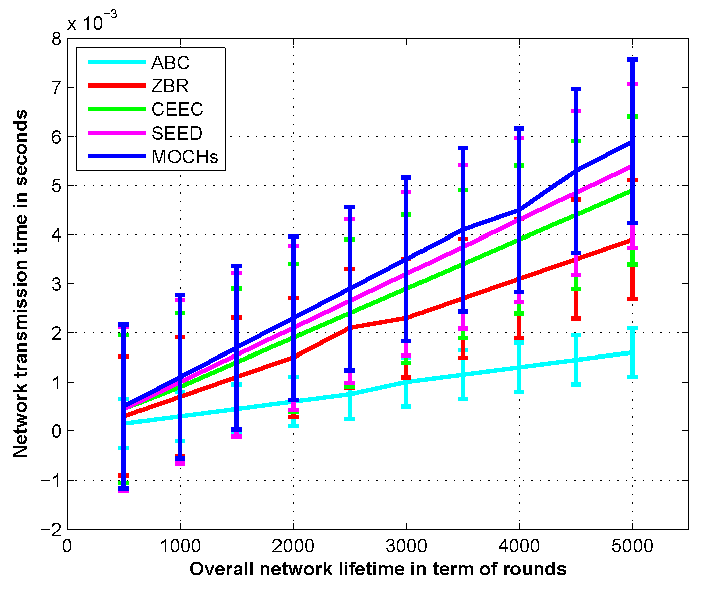 Extensive range of simulations has been performed by MATLAB to evaluate the performance of MOCHs in comparison with Sleep-awake Energy Efficient Distributed (SEED) clustering [11], ABC [9], Zonal Based Routing (ZBR) [27] and CEEC [15] in terms of First Node Dies (FND), Half Nodes Die (HND), Last Node Dies (LND), throughput of the network, the lifetime of the network, number of CHs per round, and the transmission time of the network. The selected methods for comparison purpose are very recent in the literature of WSN and functioning of these protocols is some way associated with our proposed model. We preferred CEEC [15] and ABC [9] for comparison because the CH selection and cluster formation process of ABC are centralized and controlled by the BS. Moreover, both the protocols are trying to overcome the problem of control overhead. Despite the fact that, SEED and ZBR are selected for comparison with our proposed model for the reason that both the protocols have good cluster stability and good energy management. The average results included in these simulations have confidence interval which is acquired after running the simulation 5 times. The performance comparison also reveals that the MOCHs is better than SEED [11], ABC [9], ZBR [27] and CEEC [15] in terms of energy efficiency and the network throughput.