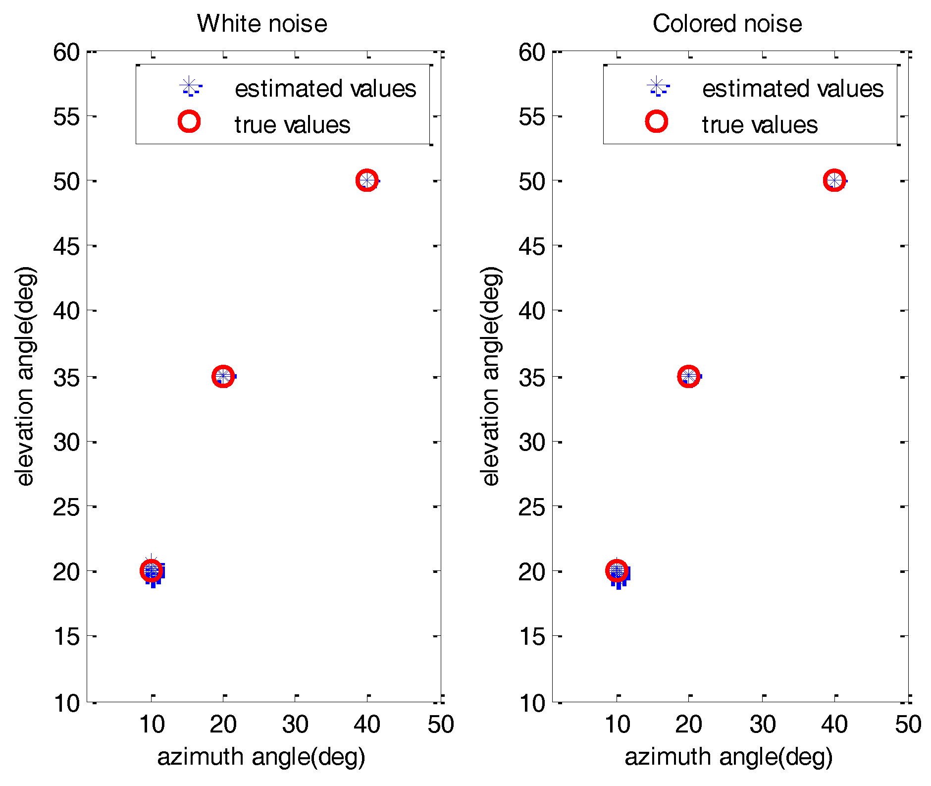 Experiment 1: Effectiveness of proposed method. In this experiment, we mainly examine the effectiveness of SDMS in the presence of white noise and colored noise conditions, where the number of sensors in each subarray is Q = 16 and the total number of snapshots is chosen to be L = 500. Here, the SNR is set as 10 dB. Figure 3 shows the estimation results of the proposed method with 100 Monte Carlo runs. As expected, all the 2D DOAs can be estimated effectively and accurately for the white noise and colored noise conditions.