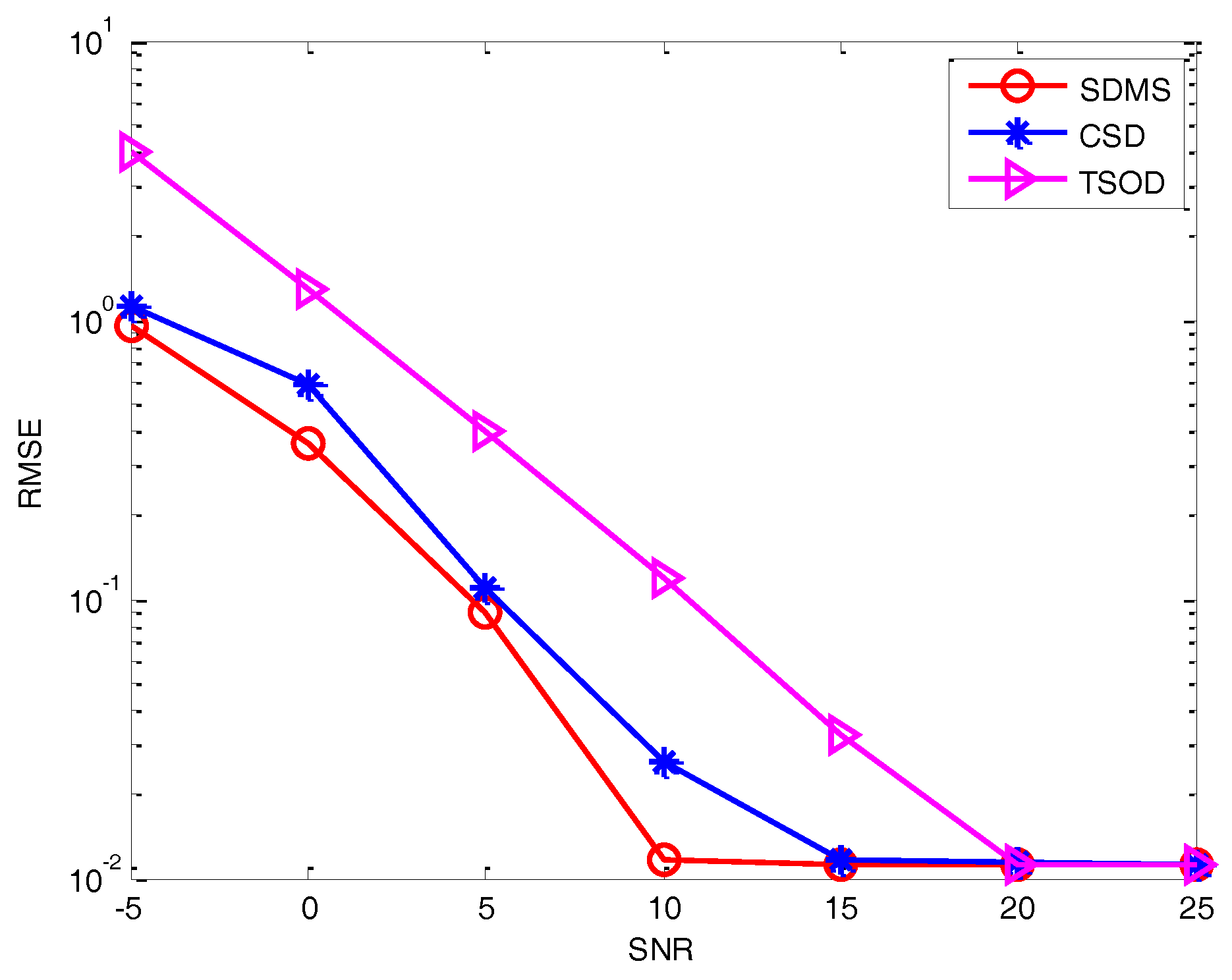 Experiment 2: Performance versus SNR. In Figure 4 and Figure 5, we evaluate the performance in terms of SNR in the white noise and colored noise conditions, where we assume L = 500 and Q = 16. Three methods are performed for comparison, including the CSD method in [18], the TSOD method in [22] and the proposed method. Moreover, the CRB is also provided. It can be observed that, due to the use of more information and the application of the difference operation, the performance of the proposed method is better than those of methods in [18,22]. In the white noise condition, the performance of CSD is better than TSOD for relatively low SNR, whereas it is the opposite with high SNR. It illustrates that the difference operation can reduce the effect of white noise in the low SNR condition, while the data loss will also decrease the performance in a high SNR condition. In the colored noise condition, since the non-diagonal elements of the noise covariance matrix have significant value, CSD is always superior to TSOD. Comparing SDMS and CSD, SDMS can achieve better performance by using more data information. To sum up, SDMS can achieve great performance improvement in the low SNR condition by using more information and performing the difference operation.