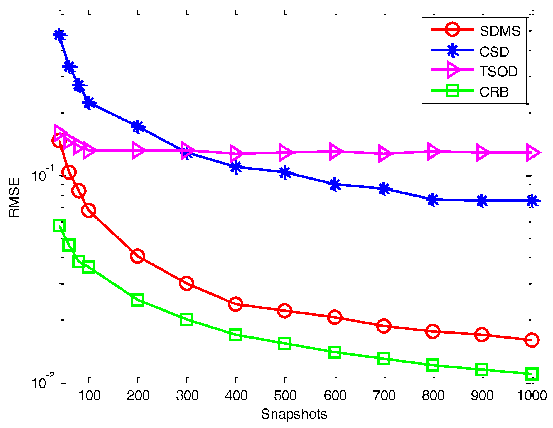 Experiment 3: Performance versus the number of snapshots. In this experiment, we evaluate the estimation performance with different methods (described in Experiment 2) in terms of the number of snapshots, where we assume the SNR is 2 dB and Q = 16. Figure 6 and Figure 7 show the RMSE versus the number of snapshots in the white noise and colored noise conditions, respectively. It is shown that, because of the use of difference operation and cross-correlation matrices, even when the number of snapshots is small, the proposed method still outperforms the methods in [18,22]. Then, for the white noise, the performance of CSD is weaker than TSOD for the small number of snapshots due to the data loss caused by the difference operation between forward and backward smoothed matrices. For colored noise, CSD performs better than TSOD. In addition, by using more data information, the performance of SDMS is also less sensitive to the number of snapshots than that of CSD.