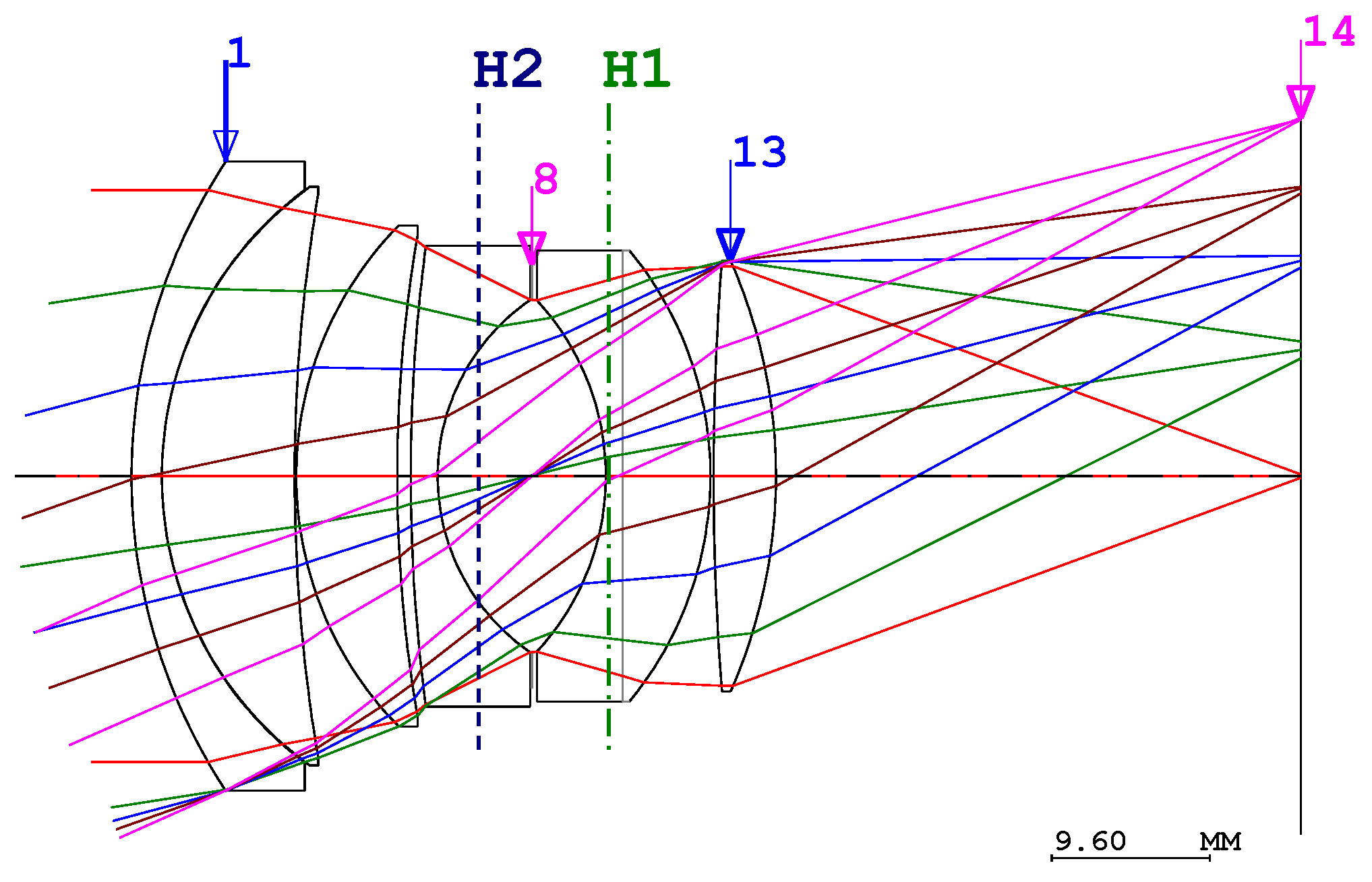 Optical layout of the conventional double-Gauss lens.