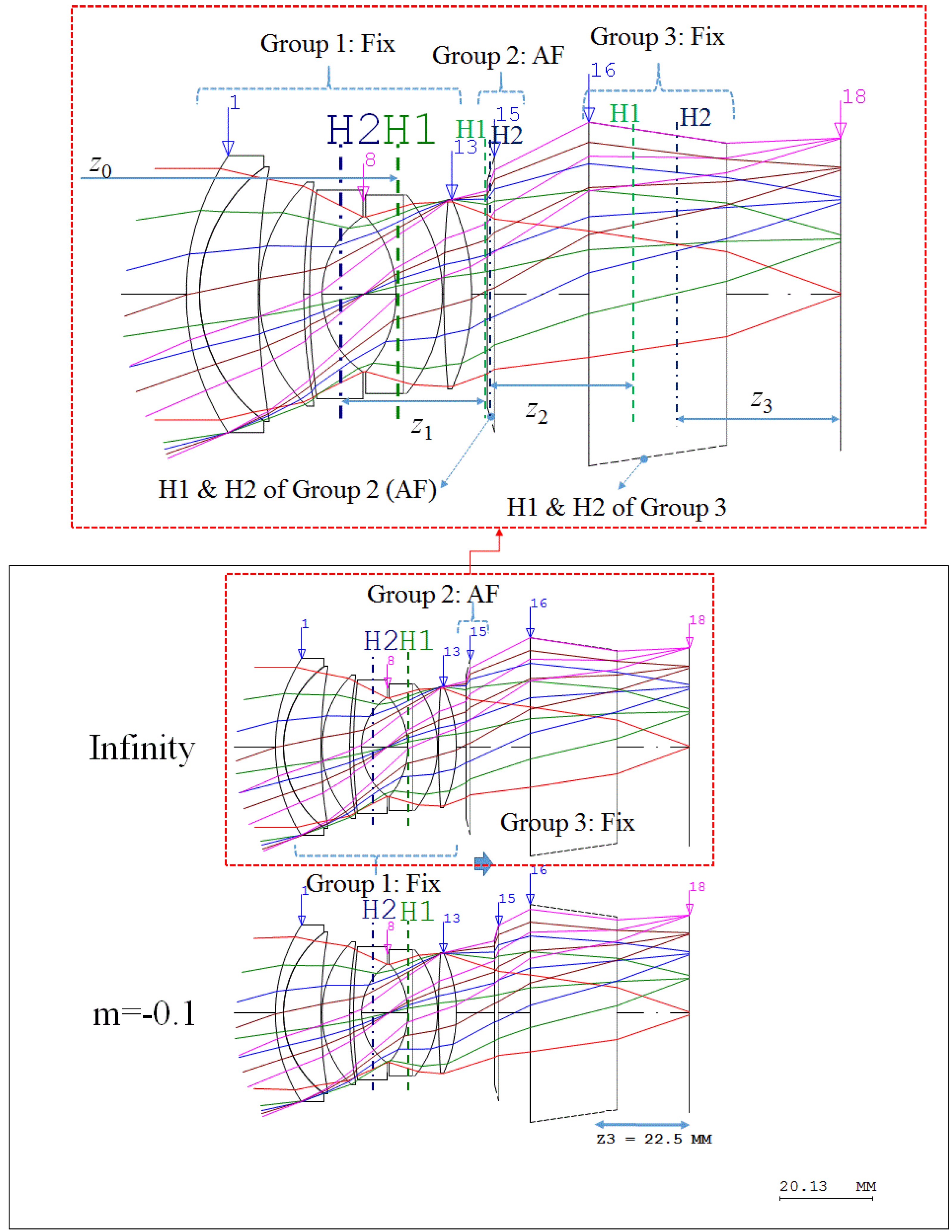 where z0 represents the distance between the object and the first principal plane (H1) of the first lens group.