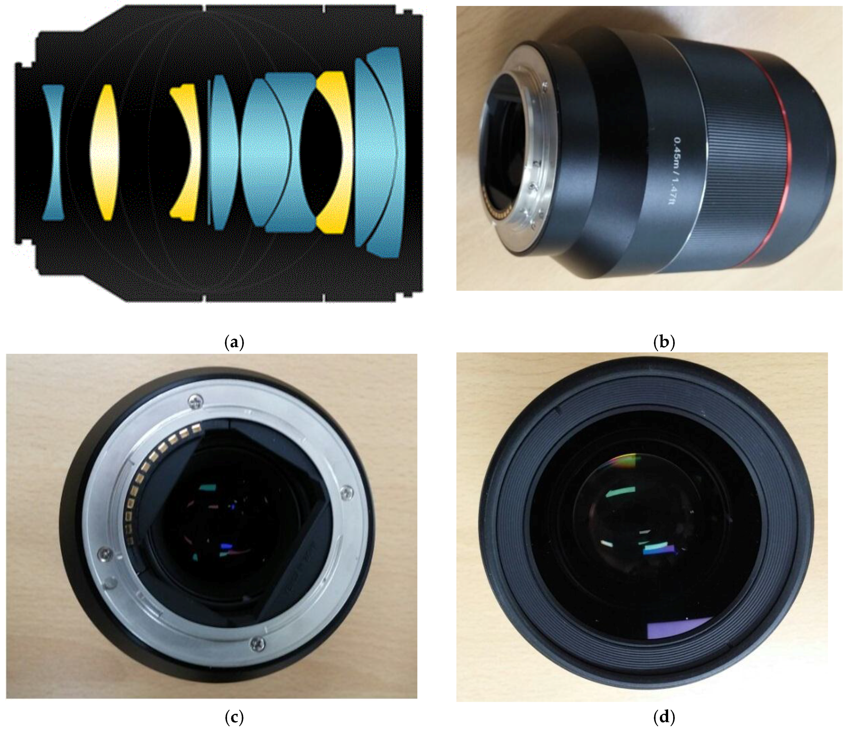 (a) Interior and (b) exterior images of our fabricated double-Gauss lens; (c) top and (d) bottom view image of our manufactured double-Gauss lens.