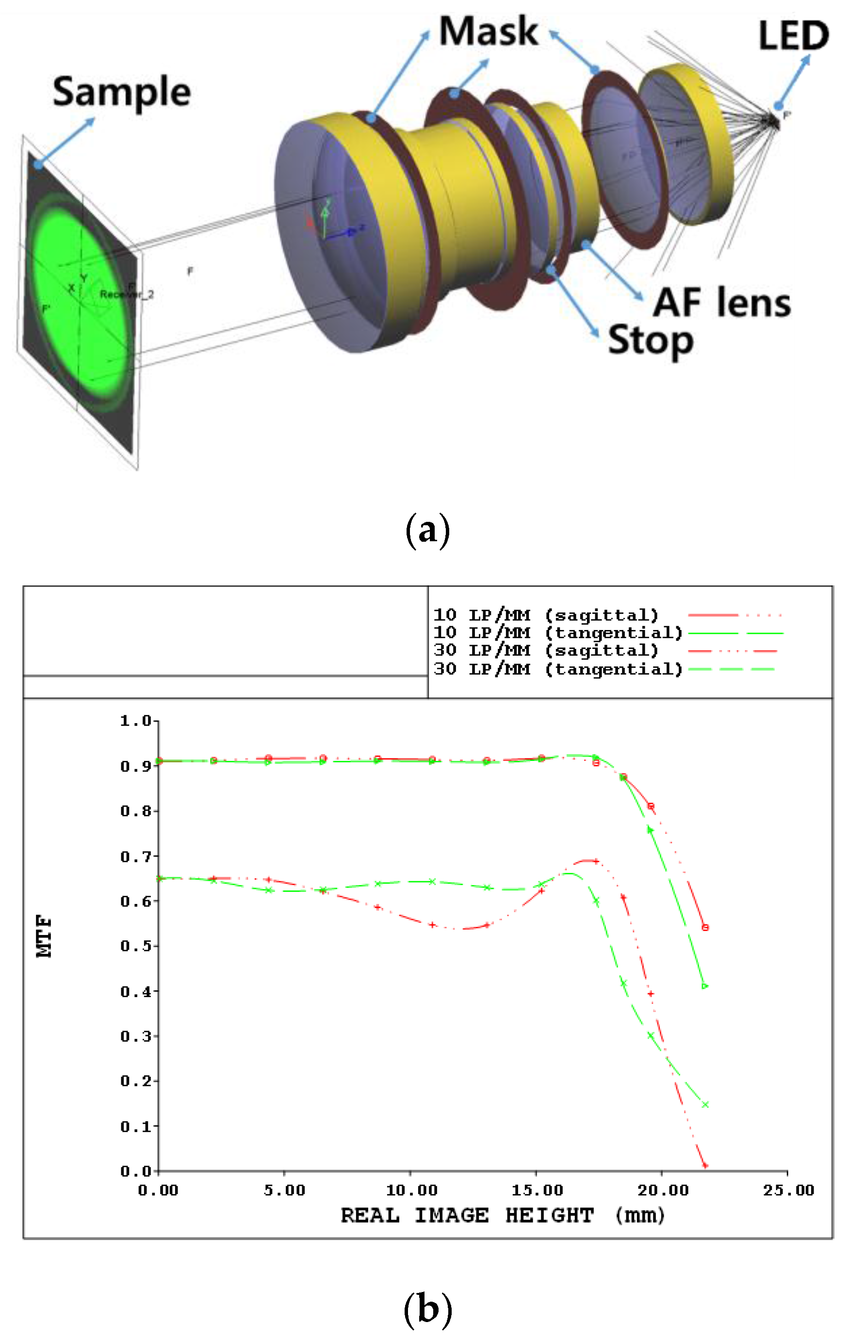 As shown in Figure 4, the designed double-Gauss lens was manufactured to achieve sufficient performances for the modulation transfer function (MTF) [35]. In Figure 5a, the three-dimensional optical layout of the designed double-Gauss lens is illustrated. In addition, we provide the expected modulation transfer function (MTF) graph to verify the resolving power performance of the lens. The image formation capability of our designed double-Gauss lens using CodeV software was confirmed as follows. Figure 5b shows the MTF graph of the optimized lens where “lp/mm” represents the units of the spatial frequency as the number of line pairs per 1 mm. Thus, 10 lp/mm means that there are 10 pairs of 0.05 mm thick black and white lines per 1 mm. “Sagittal” and “tangential” respectively imply that the lines are placed horizontally and vertically in an arbitrary cross section of the lens. As shown in Figure 5, there is no resolution degradation with the designed double-Gauss lens system up to 15 mm image height due to acceptable MTF variances within this range.