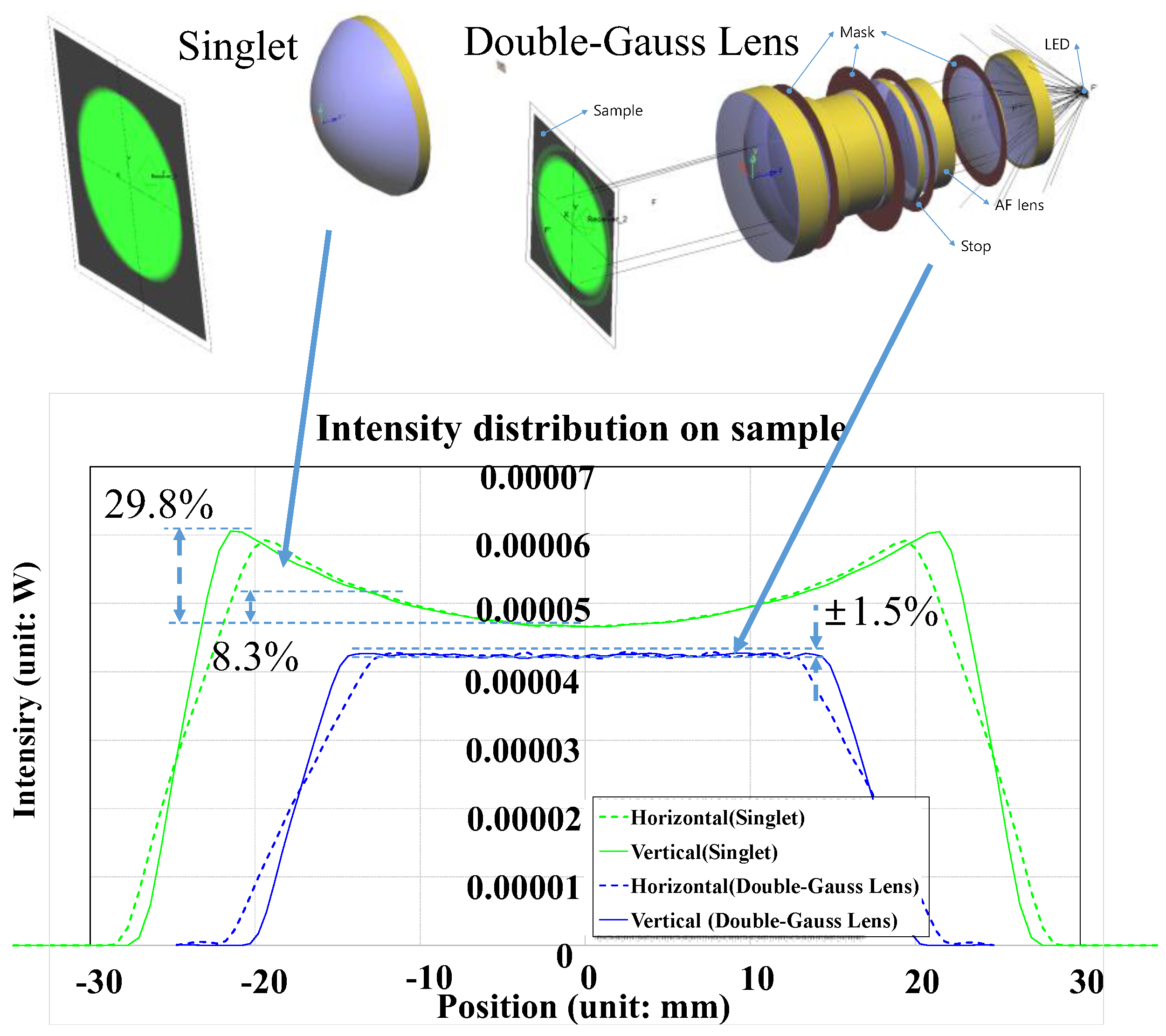 Figure 8 illustrates the optical layouts and light intensity distributions of a commonly obtainable 50 mm diameter single lens (67–277, Edmund Optics, Barrington, NJ, USA) and the custom designed lens. The graph shows that the light intensity distribution of a single lens (singlet) changes with position (29.8%) while that of our custom designed lens show negligible change (±1.5%). This is because the aberration of a single lens was not fully corrected, even for the one with an aspherical surface.