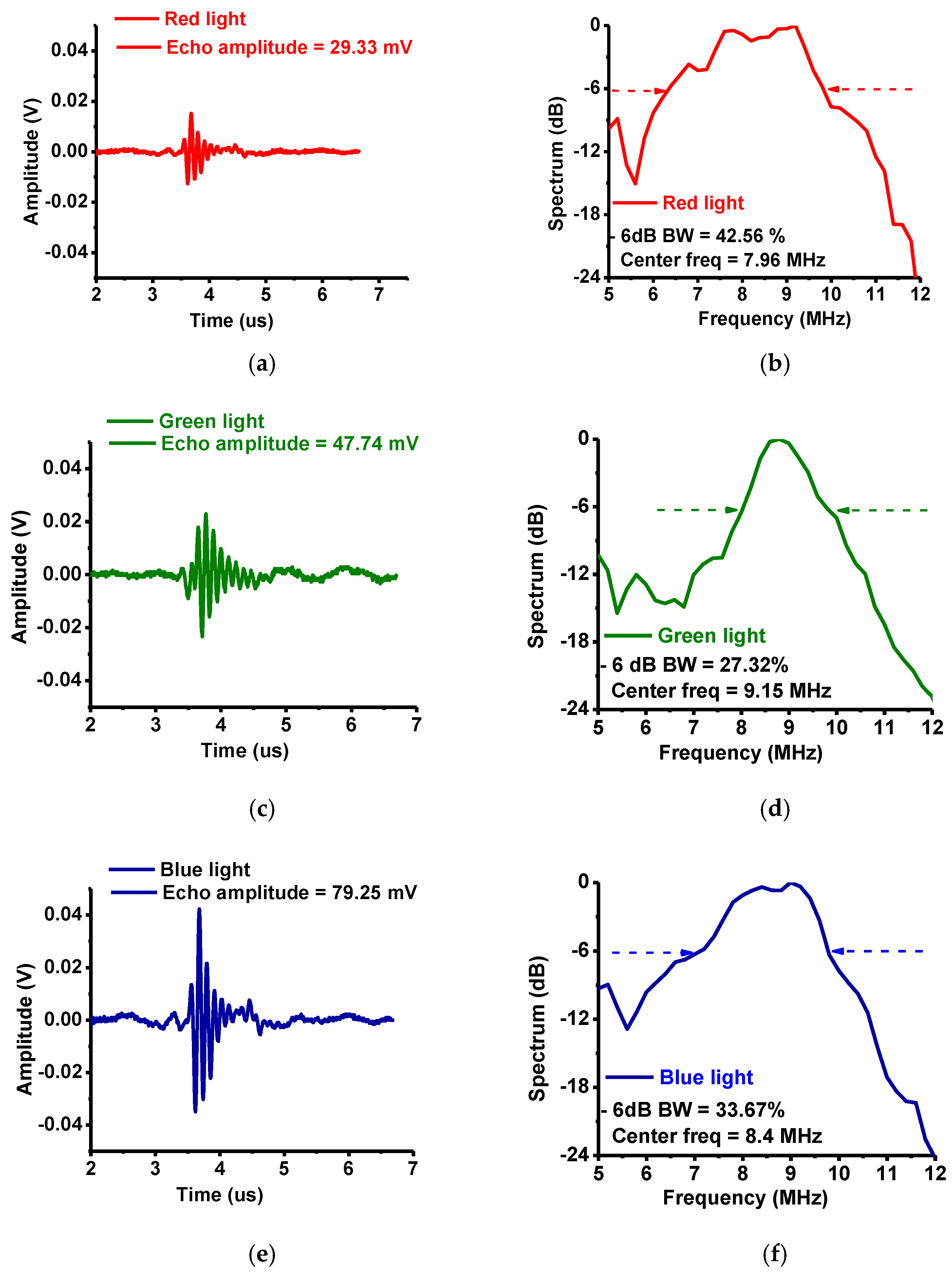 Figure 11 shows the echo waveforms in the time and frequency domains. When red, green, and blue lights were used, the detected echo waveform amplitudes were 29.33, 47.74, and 79.25 mV, respectively and the center frequencies were 7.96, 9.15, and 8.4 MHz with −6 dB bandwidths (percentages) of 42.56, 27.32, and 33.67%, respectively. Each echo waveform center frequency was obtained by averaging the frequencies at the measured −6 dB bandwidths as shown in Figure 11b,c,f. Slight shifts in the measured center frequencies of the echo waveforms may have been caused by the long coaxial cables (4 m) between the transducer and the preamplifier and attenuation in the layers of the tissue samples. However, we were able to acquire spectra of reasonable amplitudes with the setup.