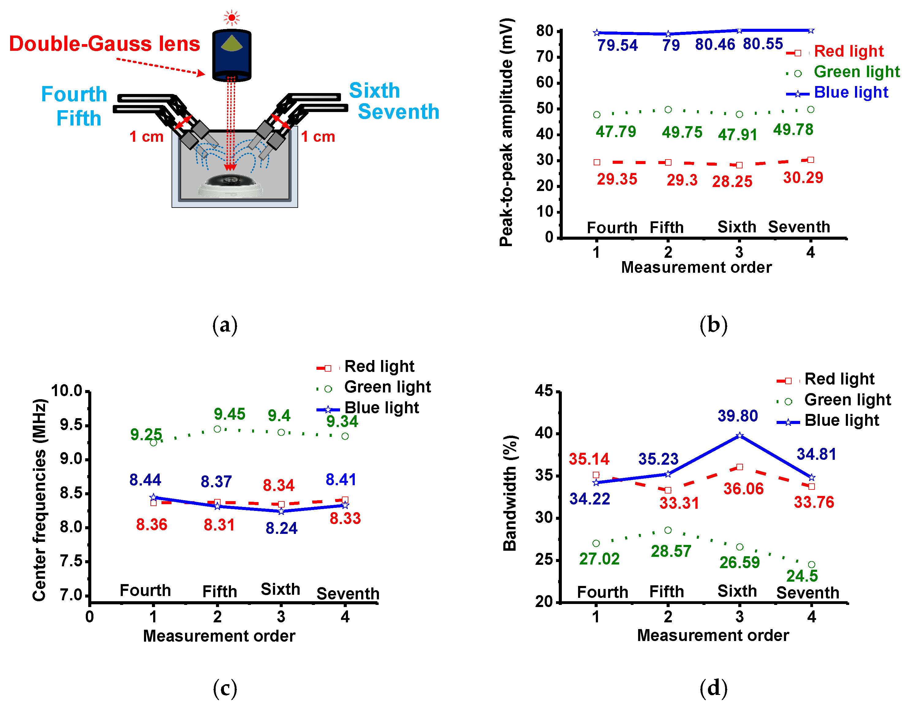 In Figure 13, the light through the lens irradiates the samples perpendicularly and a transducer was placed at an angle from the normal. Measurements were taken from both sides of the normal plane. At each position (‘fourth’ and ‘sixth’ measurements), another measurement was made after a shift of 1 cm (‘fifth’ and ‘seventh’ measurements). Figure 13b–d show the measured peak-to-peak amplitudes, center frequencies and −6 dB bandwidths of the echo signals. In this setup, relative to each other, the calculated variations of the peak-to-peak amplitudes, center frequencies, and their −6 dB bandwidths variations of the echo signals in the second and third measurement data were also small—less than 2 mV, 1 MHz, and 6%, respectively.