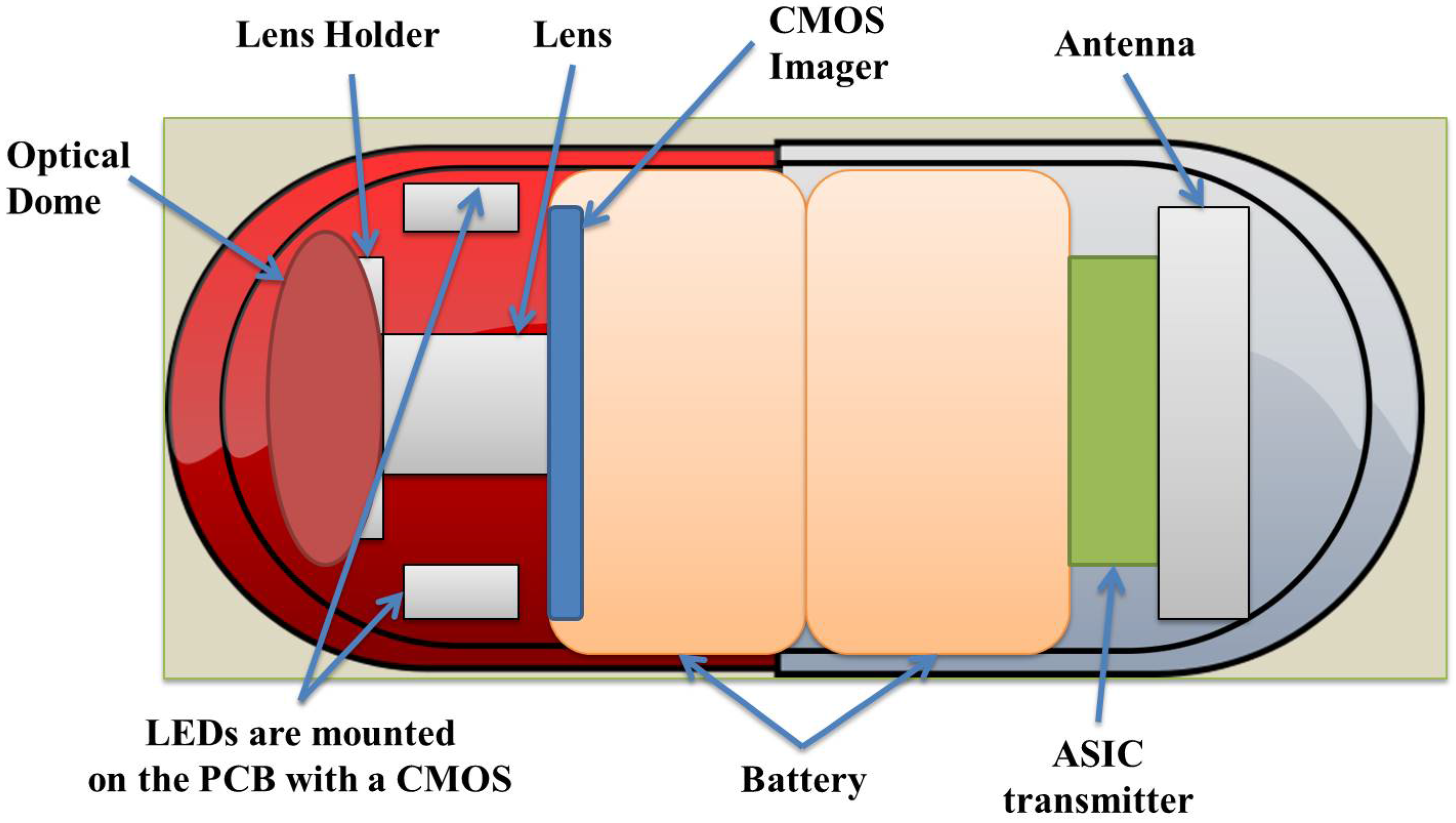 Structure of a typical wireless endoscopic capsule (WCE), based on the architecture of the M2A capsule.