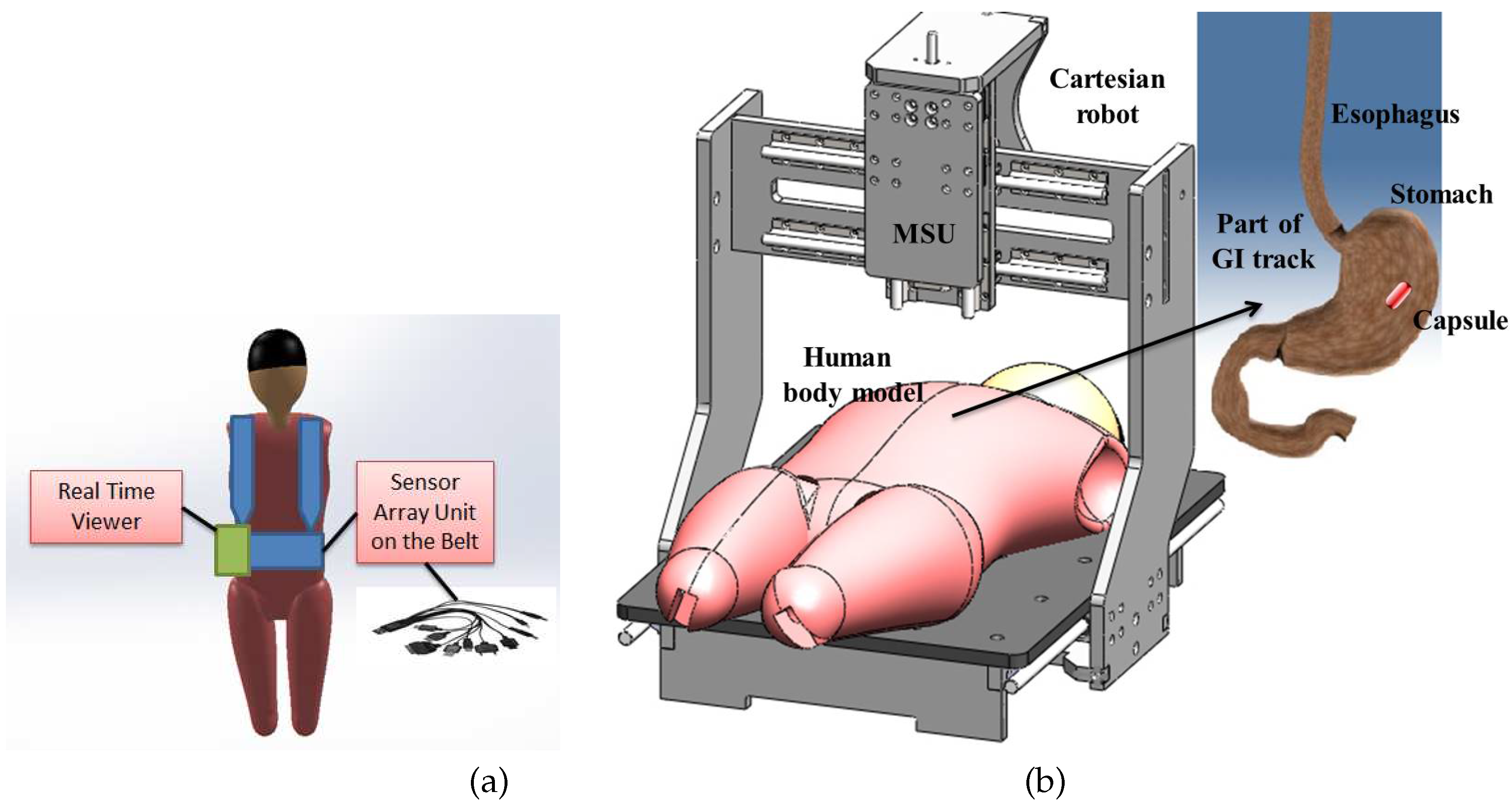 WCE starts with the patient swallowing the WEC. The natural peristalsis force of the human body helps the WEC to move through the GI tract without any harm or pain, collecting images and other data and transmitting them to a monitoring system placed outside the body. GI physiological parameters, such as temperature, pressure or pH level, can be measured by WECs. Figure 2 illustrates a typical WEC, based on the architecture of the M2A capsule [5], which is composed of an image sensor, a radio frequency (RF) data transmitter, an illumination unit and a battery. A typical WCE system comprises a spatial robot manipulator with a sensor unit attached to its end effector or a belt-shaped sensor array unit attached to the body with a real-time viewer. A sensor array unit concept attached to the body with a real-time viewer [4] and a 3D Cartesian robot concept [6] for manipulating the sensor unit are illustrated in Figure 3a,b, respectively. Other examples of spatial robots for manipulating such sensor units are reported in [7].