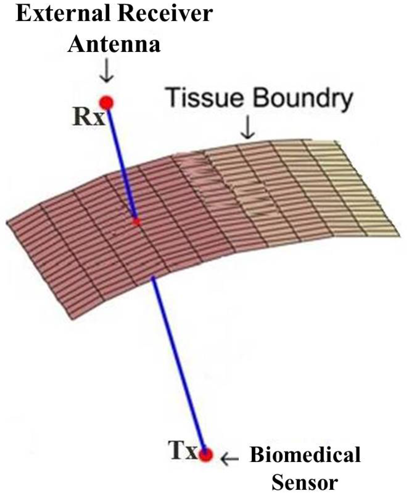 Signal transmission through tissue layers inside the human body; Tx: transmitter and Rx: receiver.