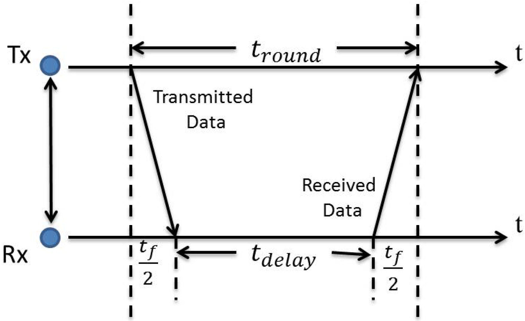 The is the average signal propagation velocity; represents the single-trip propagation time between the target node and the reference node; denotes to the processing time at the reference node; and denotes the round-trip propagation time of impulses.