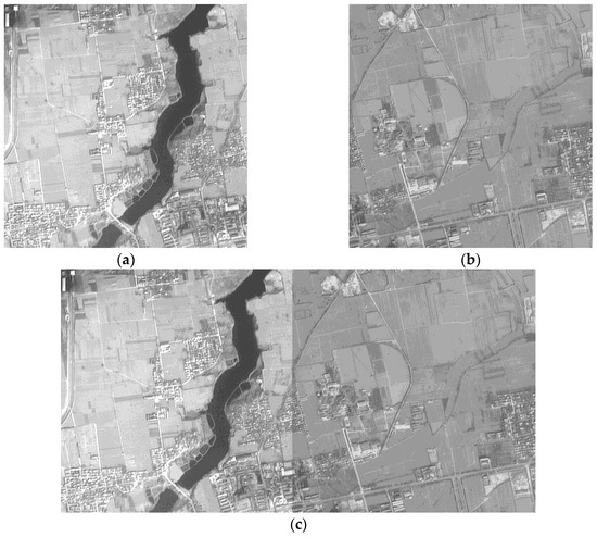All the results of different dodging algorithms are affected by the processing sequence. Therefore, two images with large contrast are processed to verify the effect of different dodging algorithms, as shown in Figure 6a,b. An obvious seam line in the image mosaicking without any dodging processing can be observed, as shown in Figure 6c. Although the method based on histogram matching weakens the difference of the original images in brightness and contrast, the seam line in the image mosaicking can also be easily observed, as shown in Figure 6d. Furthermore, the relative distance between gray levels in the processed right image is changed, resulting in the color deviation of the image with different internal features. The effect of the method based on information entropy is worse than that based on histogram matching. The seam line in the image mosaicking shown in Figure 6e almost does not achieve any improvement. The effect of the Wallis dodging method is the best, and the image mosaicking achieves consistent color without a visible seam line, as shown in Figure 6f. In summary, the results shown in Figure 6 indicate that the Wallis filter has the strongest ability to achieve consistency of image brightness and contrast.