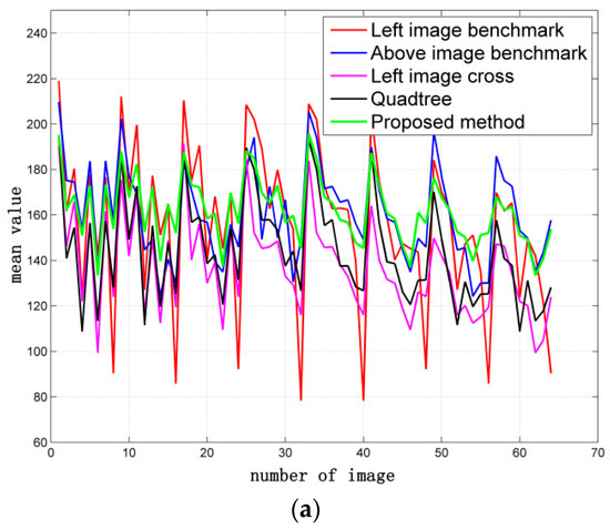 Results of different methods: (a) original image; (b) result based on left image benchmark; (c) result based on above image benchmark; (d) result based on left image cross; (e) result based on quadtree; and (f) result based on the proposed method.