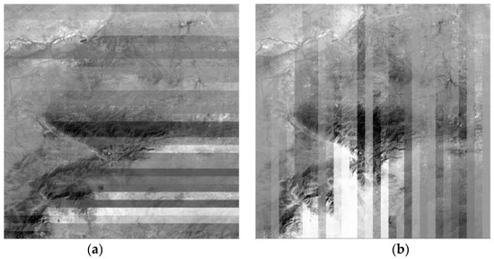 The traditional Wallis dodging algorithm generally involves a reference image and a target image. However, the target image may be adjusted according to two target images in the proposed method. In this study, two adjacent images are defined as a and b. Their overlapping areas in the horizontal direction are a right and b left, as shown in Figure 4a, whereas their overlapping areas in the vertical direction are a bottom and b top, as shown in Figure 4b. If the image to be processed and the first standard image are at the same line or column, the parameters , , , and are calculated according to the overlapping region of the target image and its adjacent image. Otherwise, two abutting images should be considered. For example, image a and right image b1 below image b2 are contiguous, as shown in Figure 4. The means , , , and and the variances , , , and are computed based on the overlapping area of three images. Then, the parameters are formulated, as expressed in Equation (6):
