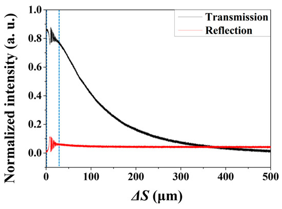 Measurement results of interference fringes depending on ΔS for both reflection and transmission spectra.