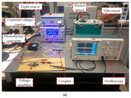Using the processed sensor and light intensity demodulation method, some simple physical experiments have been done. Figure 19 shows the equipment and the sensor used in the experiments. Intensity demodulation method is used to demodulate the vibration signal. Broadband light is generated from the ASE light source and goes into the sensor through the coupler and reference FBG. The reflectance spectrum of the reference FBG is partly overlapping with that of the sensor. When the spectrum of the sensor changes with the vibration, the light intensity reflected by the sensor and the reference FBG will change accordingly [26], which can be used to demodulate the vibration or stress. The photoelectric converter transforms the light signals into electrical signals, which is enlarged by the 800-time voltage amplifier before being detected by the oscilloscope. The voltage amplifier is driven by the constant voltage source. The sensor is pasted on the vibrostand. The diagram of the demodulation method is shown in Figure 20.