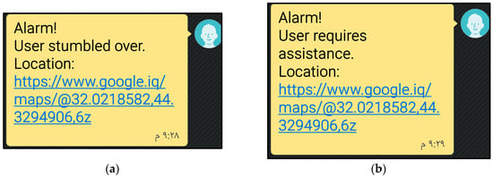 We implemented the proposed system as shown in Figure 3 and tested its functionality with users wearing it, as shown in Figure 4. The alarm SMSs transmitted from the system to the family and caregivers’ mobile phones are shown in Figure 5a,b, for the stumbling alarm and the assistance request, respectively. The SMSs with the system location and tracking status requested by family and caregivers are shown in Figure 5c,d, respectively. Finally, the system location in Google Maps and the system tracking are shown in Figure 6a,b, respectively.
