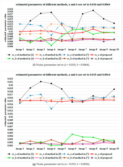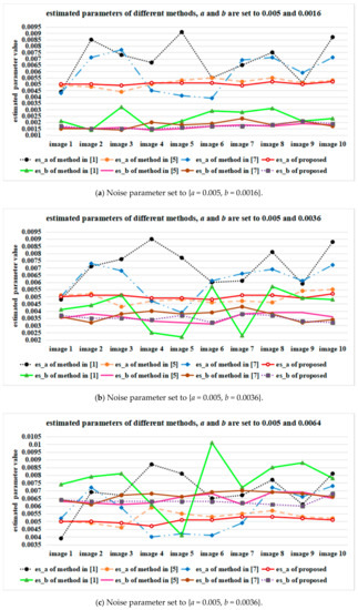 Figure 7 and Figure 8 clearly show that the estimated value of parameter a processed by the proposed method is closer to the preset parameter than that processed by other methods, even when the Poisson noise component is strong. On the contrary, the proposed method obtains comparable results to those of the other methods when the Gaussian noise component is strong.