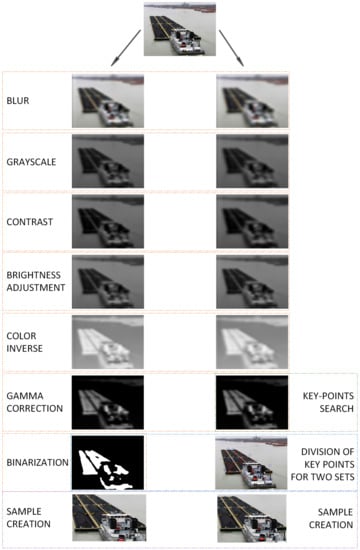To check the operation of the proposed method, the authors used an image database divided into four classes, each of them composed of 200 samples. The classes represented four types of ships—a boat, a motor yacht, a navy ship, and a historic ship. The image processing method presented in Section 2 was tested on different values of parameters in the range {0, 15}. The adjustment of these values for the system led to the setting of an average number of key points. All coefficients were used in different combinations, and the authors selected one that returned approximately 15–20 key points (after processing). The selected configuration for image processing is presented in Table 1. This number is not accidental because the authors noticed that if the number of key points was small, the worse area was returned. On the contrary, when the number of key points was large, the original image was returned. This is why the configuration was chosen in an empirical manner.