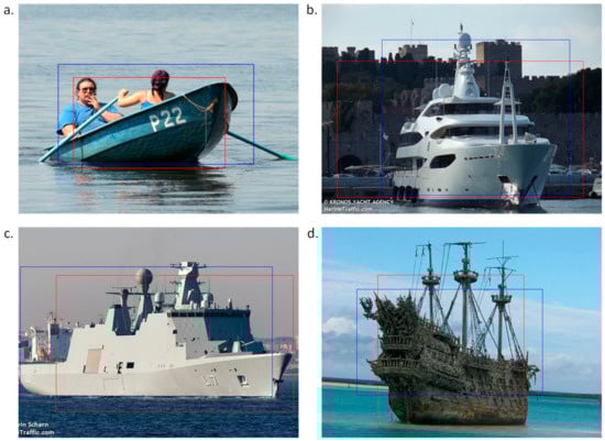 Sample examples of images, where the rectangles indicate the extracted images: (a) boat; (b) motor yacht; (c) navy ship; and (d) historic ship.