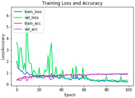 Table 2 presents the structure of the classification network. The layers were selected in order to obtain the highest effectiveness. It was noted that the proposed technique for the division of samples in the ratio 80:20 (training:verification) and the learning rate of η = 0.001 gives the best results. We trained the classifier during 100 epochs. The resulting efficiency was 89%. A graph of the training is shown in Figure 3.