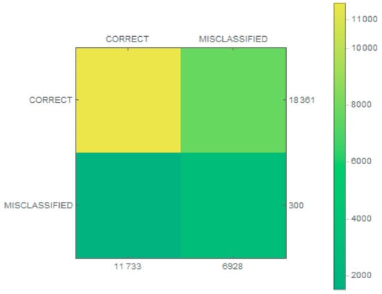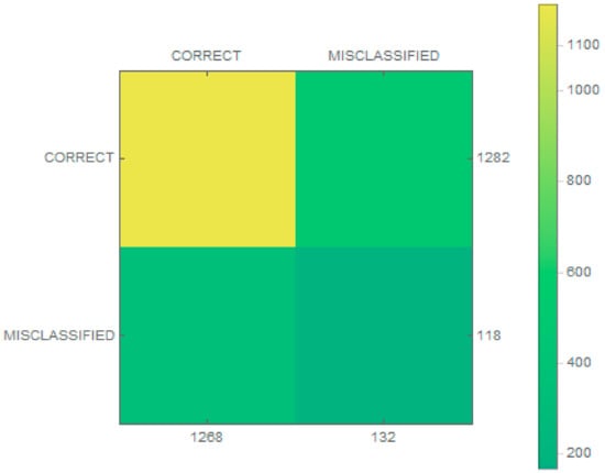 The resulting effectiveness was nearly 92%, which is high considering that a small number of samples were used for training. A higher value was obtained for sensitivity, which implies accurate prediction of true samples. The F1 score was also high, which indicates that the classifier was efficient. Considerably worse results were obtained for specificity, nearly 0.541, implying that the classification of true negatives was substandard. The same result was obtained for the rate of false omission, indicating that a large portion (almost 30%) of the false samples had been rejected.