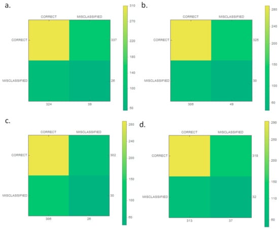 The confusion matrices of the classification model for each class: (a) boat; (b) motor yacht; (c) navy ship; and (d) historic ship.