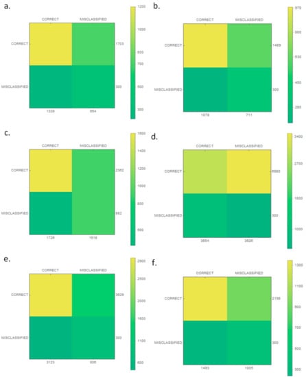 The confusion matrices of the classification model for each class: (a) barge; (b) yacht; (c) marine service; (d) motorboat; (e) passenger; and (f) other.