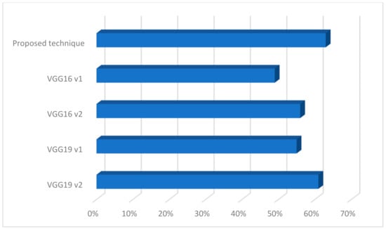 In our experiments, we used a strategy to train some layers and leave others frozen in existing models of CNN such as VGG16 and VGG19 []. Such a strategy was used to transfer knowledge from previously trained classifiers so as not to train classifiers from scratch. While choosing to leave specific layers, we paid attention to possible overfitting. We have chosen a few examples of architectures to illustrate the proposed solution with existing ones. In the case of the first version (on the chart v1), the last five layers were frozen, and in the second case (on the charts v2), it was the last six layers. In both cases, two layers were added to the architecture as fully connected ones—in both cases, a first layer was composed of 512 neurons and a ReLu function, and the last one had six neurons. This architecture yielded less effectiveness than the proposed technique. Summarizing, the proposed solution can be used in the system being built. Although the classes are similar, the network was able to classify the images. However, the number of samples in the database should be increased.