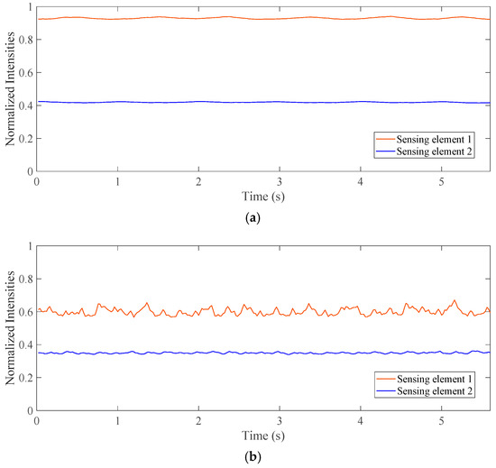 The flow patterns of the gas-liquid two-phase CO2 flow have influences on the void fraction measurement. The effects of the flow patterns are investigated using two photodiode sensing elements, respectively placed in the top and bottom regions of the pipeline. Figure 6 depicts the normalized intensity of the laser beams of different patterns from two sensing elements. As can be seen from Figure 6a, the normalized intensities of the laser beam passing through the stratified flow remain stationary, but the decreased amplitudes are different. However, it is obvious that the normalized laser beam intensities passing through the bubble flow display fluctuations, as shown in Figure 6b,c. Because of the effect of gravity, the bubbles are mostly distributed in the upper part of the horizontal pipeline; thus, the normalized intensities of the laser beams passing through the top part of the pipeline have a stronger fluctuation than those passing through the bottom part. Moreover, both of the normalized intensities of the laser beams passing through the bubble flow in the vertical test section have a significant fluctuation; this is because the bubbles are evenly distributed in the vertical pipeline. Therefore, it is necessary to separately discuss the measurement accuracy for the different flow patterns.