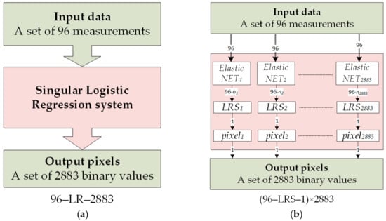 The originality of the algorithm is analogous in both the EIT and UST applications. Figure 2a concerns the EIT. It shows an algorithm based on the structure of an ordinary, singular logistic regression unit with 96 inputs and 2883 binary {0,1} outputs. In Figure 2b, for comparison, the multiple LRS with elastic nets scheme is shown. Each of the 2883 LRS after the input data reduction using elastic nets generates a binary classifier as the output, which is a pixel value. Then, reconstructions of all 2883 pixels make up the output image. In the case of UST, the workflow is the same. Only the number of inputs and the resolution of the reconstructed image change.