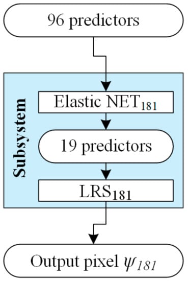 At the input of the EIT system, there are 96 electrical measurements. Then, thanks to the elastic net, each input vector dedicated to a specific pixel is reduced to a dozen or so elements. This situation is shown in Figure 4 where 96 predictors of pixel No. 181 (ψ181) are reduced to 19.