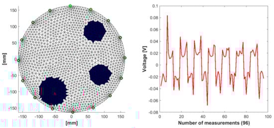 Simulation training cases were generated in such a way as to take into account various (random) amounts of inclusions, diameters and positions relative to the tank wall. The presented model corresponds to a 96-element voltage measurement vector. Polarity of the electrodes changes during individual measurements. For this reason, the voltages take positive and negative values. A more precise method of generating simulation data in the form of pseudocode is presented in the article [].
