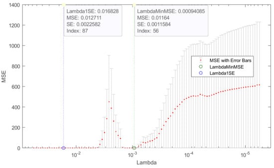 Figure 6 shows a cross-validated MSE (mean squared error) of the elastic net with α = 0.9 for an exemplary single pixel ψ181 of the output image. Coefficient α in Equation (10) is the weight of LASSO versus ridge optimization. The value α = 1 represents LASSO regression, α close to 0 approaches ridge regression, and other values represent elastic net optimization.